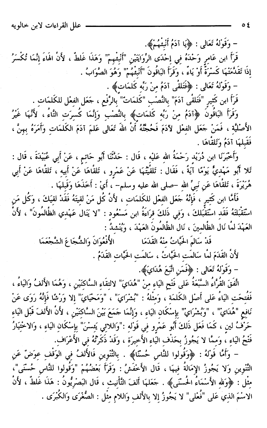 - وَأَمَّا قَوْلُهُ: {وَقُولُوا لِلنَّاسِ حُسْنًا}. بالتنوين فالألف في الوقف عوض عن التَّنْوِينِ وَلَا يَجُوزُ الْإِمَالَةُ فِيهَا، قَالَ الْأَخْفَشُ: وقرأ بعضهم «وقولوا للناس حسنى»، مثل: {ولله الْأَسْمَاءُ الْحُسْنَى}. جَعَلَهَا أَلِفَ التَّأْنِيثِ، قَالَ الْبَصْرِيُّونُ: هَذَا غَلَطٌ، لِأَنَّ الِاسْمَ الَّذِي عَلَى «فُعْلَى» لَا يَجُوزُ إِلَّا بِالْأَلِفِ وَاللَّامِ مِثْلَ: الصُّغْرَى والكبرى.