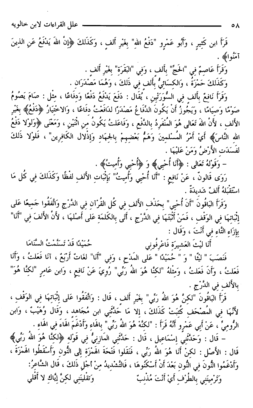 - قَالَ: وَحَدَّثَنِي إِسْمَاعِيلُ، قَالَ: حَدَّثَنِي الْمَازِنِيُّ فِي قَوْلِهِ {لَكِنَّا هُوَ اللَّهُ رَبِّي} قَالَ: الْأَصْلُ: لَكِنْ أَنَا هُوَ اللَّهُ رَبِّي، فَنَقَلُوا فَتْحَةَ الْهَمْزَةِ إِلَى النُّونِ وَأَسْقَطُوُا الْهَمْزَةَ، وَأَدْغَمُوُا النُّونَ فِي النُّونِ بَعْدَ أَنْ أَسْكَنُوهَا، فالتشديد من أجل ذَلِكَ، قَالَ الشَّاعِرُ:
