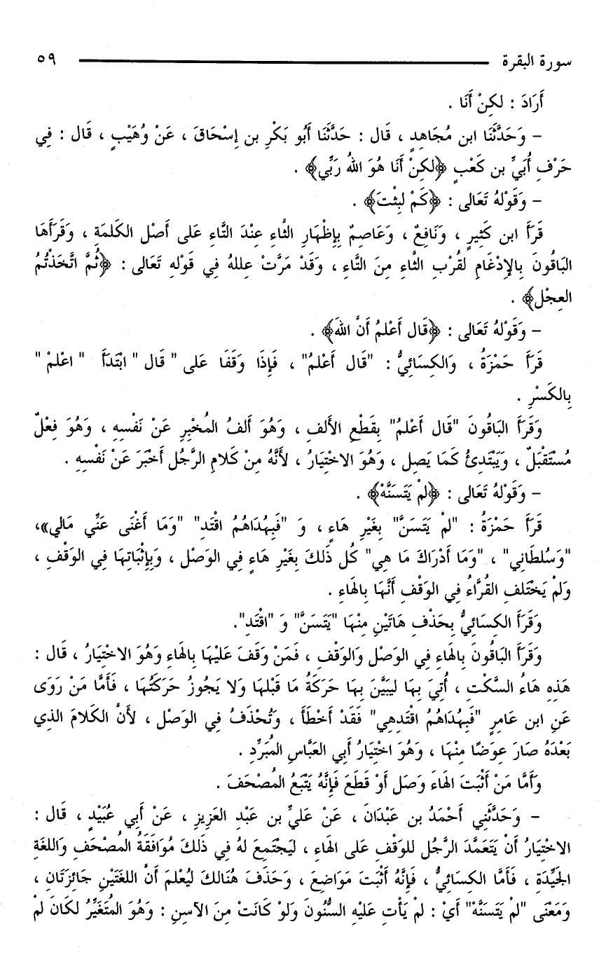 الِاخْتِيَارُ أَنْ يَتَعَمَّدَ الرَّجُلُ لِلْوَقْفِ عَلَى الْهَاءِ، لِيَجْتَمِعَ لَهُ فِي ذَلِكَ مُوَافَقَةُ الْمُصْحَفِ وَاللُّغَةِ الْجَيِّدَةِ، فَأَمَّا الْكِسَائِيُّ، فَإِنَّهُ أَثْبَتَ مَوَاضِعَ، وَحَذَفَ هُنَالِكَ لِيُعْلِمَ أَنَّ اللُّغَتَيْنِ جَائِزَتَانِ، وَمَعْنَى «لَمْ يَتَسَنَّهْ» أَيْ: لَمْ يَأْتِ عَلَيْهِ السُّنُونَ وَلَوْ كَانَتْ مِنَ الْآسِنِ: وَهُوَ الْمُتَغَيِّرُ لَكَانَ لَمْ