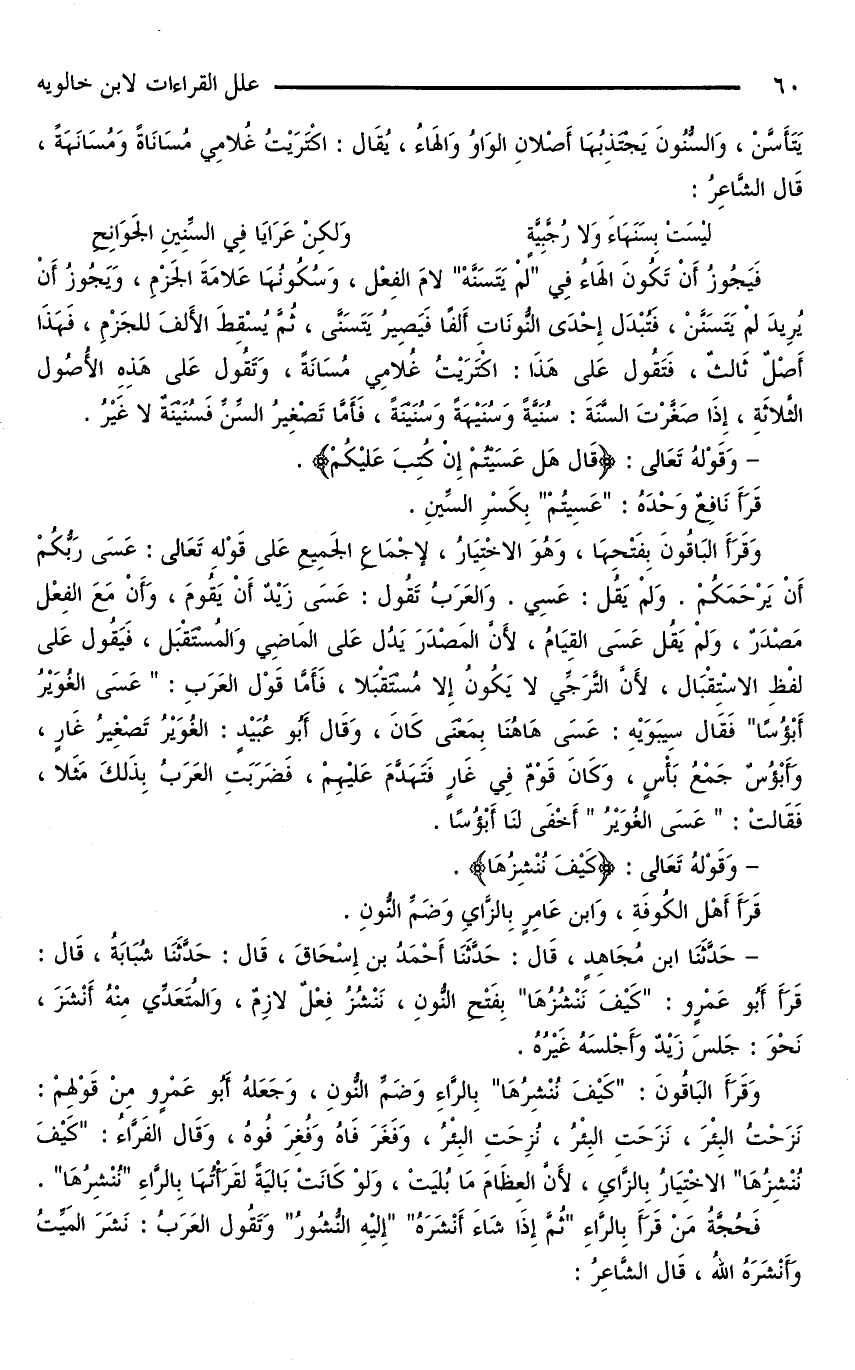 وَقَرَأَ الْبَاقُونَ بِفَتْحِهَا، وَهُوَ الِاخْتِيَارُ، لِإجْمَاعِ الْجَمِيعِ عَلَى قَوْلِهِ تَعَالَى: عَسَى رَبُّكُمْ أَنْ يَرْحَمَكُمْ. وَلَمْ يَقُلْ: عَسِى. وَالْعَرَبُ تَقُولُ: عَسَى زَيْدٌ أَنْ يَقُومَ، وَأَنْ مَعَ الْفِعْلِ مَصْدَرٌ، وَلَمْ يَقُلْ عَسَى الْقِيَامُ، لِأَنَّ الْمَصْدَرَ يَدُلُّ عَلَى الْمَاضِي وَالْمُسْتَقْبَلِ، فَيَقُولُ عَلَى لَفْظِ الِاسْتِقْبَالِ، لِأَنَّ التَّرَجِّي لَا يَكُونُ إِلَّا مُسْتَقْبَلًا، فَأَمَّا قَوْلُ الْعَرَبِ: «عَسَى الْغُوَيْرُ أَبْؤُسًا» فَقَالَ سِيبَوَيْهِ: عَسَى هَاهُنَا بِمَعْنَى كَانَ، وَقَالَ أَبُو عُبَيْدٍ: الْغُوَيْرُ تَصْغِيرُ غَارٍ، وَأَبْؤُسٌ جَمْعُ بَأْسٍ، وَكَانَ قَوْمٌ فِي غَارٍ فَتَهَدَّمَ عَلَيْهِمْ، فَضَرَبَتِ الْعَرَبُ بِذَلِكَ مَثَلًا، فَقَالَتْ: «عَسَى الْغُوَيْرُ» أَخْفَى لَنَا أَبْؤُسًا.