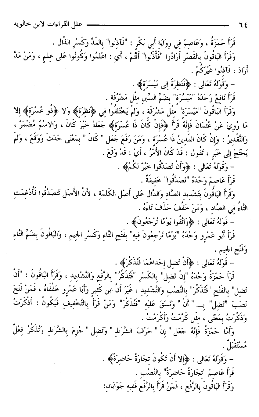 وَقَرَأَ الْبَاقُونَ «مَيْسَرَةٍ» مِثْلَ مَشْرَقَةٍ، وَلَمْ يَخْتَلِفُوا فِي (نَظِرَةٍ) وَلَا {ذُو عُسْرَةٍ} إِلَّا مَا رُوِيَ عَنْ عُثْمَانَ فَإِنَّهُ قَرَأَ «فَإِنْ كَانَ ذَا عُسْرَةٍ» جَعَلَهُ خَبْرَ كَانَ، وَالِاسْمُ مُضْمَرٌ، وَالتَّقْدِيرُ: وَإِنْ كَانَ الْمَدِينُ ذَا عُسْرَةٍ، وَمَنَ رَفَعَ جَعَلَ «كَانَ» بِمَعْنَى حَدَثَ وَوَقَعَ، وَلَمْ يَحْتَجْ إِلَى خَبَرٍ، تَقُولُ: قَدْ كَانَ الْأَمْرُ، أَيْ: قَدْ وَقَعَ.