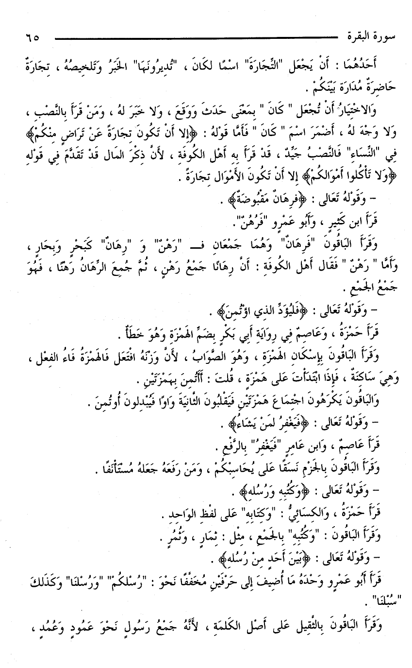وَقَرَأَ الْبَاقُونَ «فَرِهَانٌ»» وَهُمَا جَمْعَانِ فِ «رَهْنٍ» وَ «رِهَانٍ» كَبَحْرِ وَبِحَارٍ، وَأَمَّا «رَهْنٌ» فَقَالَ أَهْلُ الْكُوفَةِ: أَنَّ رِهَانًا جَمْعُ رَهْنٍ، ثُمَّ جُمِعَ الرِّهَانُ رَهْنًا، فَهُوَ جَمْعُ الْجَمْعِ.