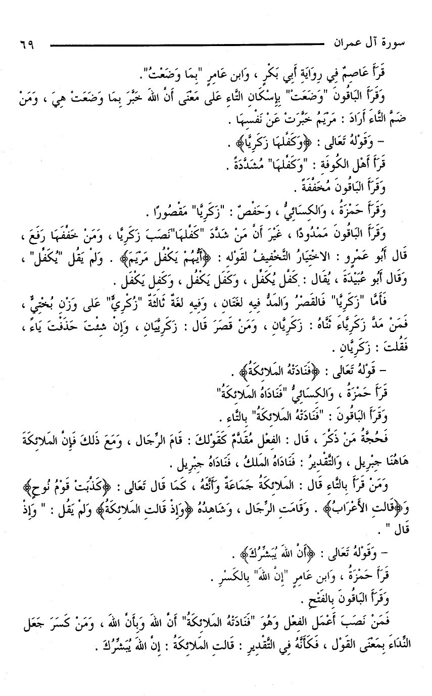 وَقَرَأَ الْبَاقُونَ مَمْدُودًا، غَيْرَ أَنَّ مَنْ شَدَّدَ «كَفَّلَهَا» نَصَبَ زَكَرِيَّا، وَمَنْ خَفَّفَهَا رَفَعَ، قَالَ أَبُو عَمْرٍو: الِاخْتِيَارُ التَّخْفِيفُ لِقَوْلِهِ: {أَيُّهُمْ يَكْفُلُ مَرْيَمَ}. وَلَمْ يَقُلْ «يُكَفِّلُ»، وَقَالَ أَبُو عُبَيْدَةَ، يُقَالُ: كَفَّلَ يُكَفِّلُ، وَكَفَلَ يَكْفُلُ، وَكَفِلَ يَكْفَلُ.
