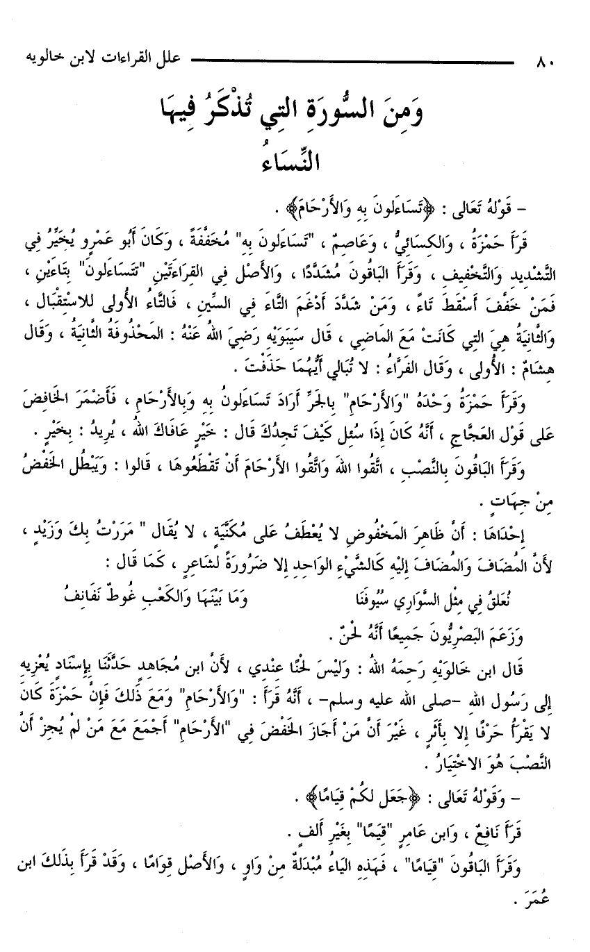 قَالَ ابْنُ خَالَوَيْهِ رَحِمَهُ اللَّهُ: وَلَيْسَ لَحْنًا عِنْدِي، لِأَنَّ ابْنَ مُجَاهِدٍ حَدَّثَنَا بِإِسْنَادٍ يُعْزِيهِ إِلَى رَسُولِ الله - صلى الله عليه وسلم -، أنه قرأ: «وَالْأَرْحَامِ» وَمَعَ ذَلِكَ فَإِنَّ حَمْزَةَ كَانَ لَا يَقْرَأُ حَرْفًا إِلَّا بِأَثَرٍ، غَيْرَ أَنَّ مَنْ أَجَازَ الْخَفْضَ فِي «الْأَرْحَامِ» أَجْمَعَ مَعَ مَنْ لَمْ يُجِزْ أَنَّ النَّصْبَ هُوَ الِاخْتِيَارُ.