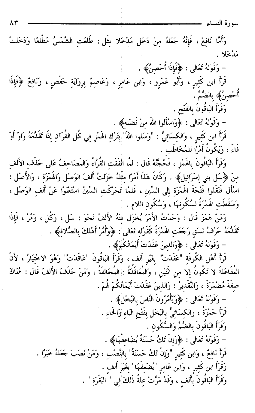 قَرَأَ ابْنُ كَثِيرٍ، وَأَبُو عَمْرٍو، وَابْنُ عَامِرٍ، وَعَاصِمٌ بِرِوَايَةِ حَفْصٍ، وَنَافِعٌ {فَإِذَا أُحْصِنَّ} بِالضَّمِّ.