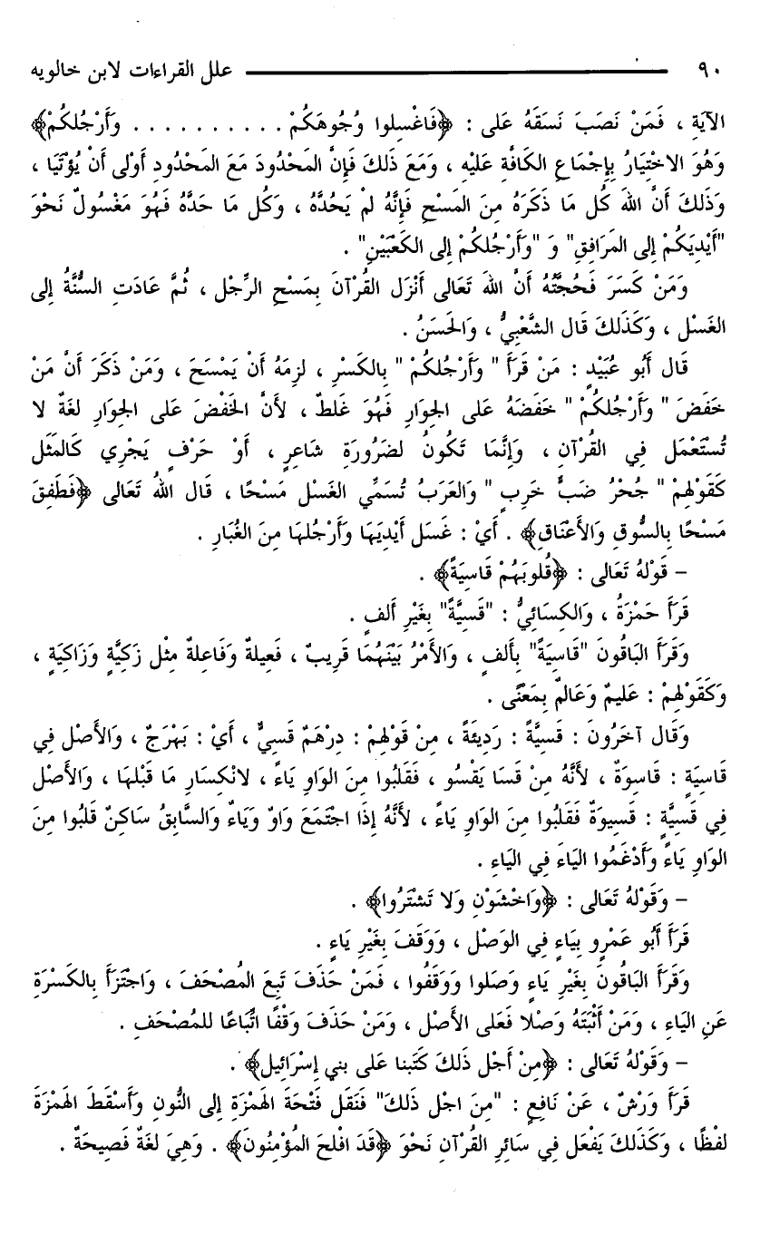 قَالَ أَبُو عُبَيْدٍ: مَنْ قَرَأَ «وَأَرْجُلِكُمْ» بِالْكَسْرِ، لَزِمَهُ أَنْ يَمْسَحَ، وَمَنْ ذَكَرَ أَنَّ مَنْ خَفَضَ «وَأَرْجُلِكُمْ» خَفَضَهُ عَلَى الْجِوَارِ فَهُوَ غَلَطٌ، لِأَنَّ الْخَفْضَ عَلَى الْجِوَارِ لُغَةٌ لَا تُسْتَعْمَلُ فِي الْقُرْآنِ، وَإِنَّمَا تَكُونُ لِضَرُورَةِ شَاعِرٍ، أَوْ حَرْفٍ يَجْرِي كَالْمَثَلِ كَقَوْلِهِمْ «جُحْرُ ضَبٍّ خَرِبٍ» وَالْعَرَبُ تُسَمِّي الْغَسْلَ مَسْحًا، قَالَ اللَّهُ تَعَالَى {فَطَفِقَ مَسْحًا بِالسُّوقِ وَالْأَعْنَاقِ}. أَيْ: غَسَلَ أَيْدِيَهَا وَأَرْجُلَهَا مِنَ الْغُبَارِ.