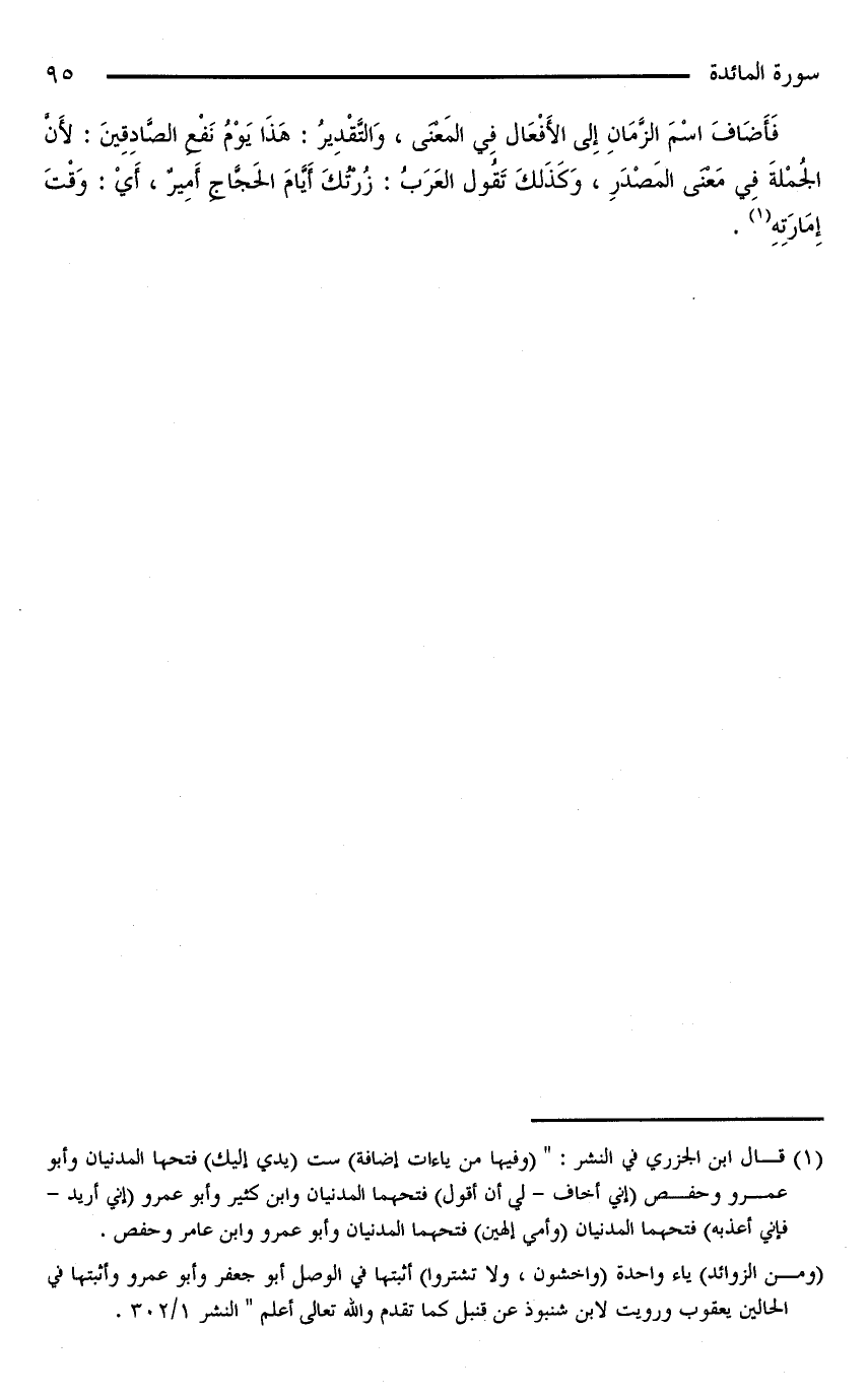 فَأَضَافَ اسْمَ الزَّمَانِ إِلَى الْأَفْعَالِ فِي الْمَعْنَى، وَالتَّقْدِيرُ: هَذَا يَوْمُ نَفْعِ الصَّادِقِينَ: لِأَنَّ الْجُمْلَةَ فِي مَعْنَى الْمَصْدَرِ، وَكَذَلِكَ تَقُولُ الْعَرَبُ: زُرْتُكَ أيام الحجاج أمير، أي: وقت إمارته (¬١).