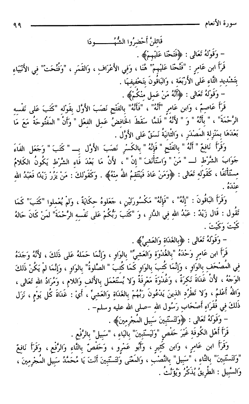 قَرَأَ ابْنُ عَامِرٍ وَحْدَهُ «بِالْغُدْوَةِ وَالْعَشِيِّ» بِالْوَاوِ، وَإِنَّمَا حَمَلَهُ عَلَى ذَلِكَ، لِأَنَّهُ وَجَدَهُ فِي الْمُصْحَفِ بِالْوَاوِ، وَإِنَّمَا كُتِبَ بِالْوَاوِ كَمَا كُتِبَ «الصَّلَوةُ» بِالْوَاوِ، وَإِنَّمَا لَمْ يَكُنْ ذَلِكَ الْوَجْهُ، لِأَنَّ غَدَاةَ نَكِرَةٌ، وَغُدْوَةَ مَعْرِفَةٌ وَلَا يُسْتَعْمَلُ بِالْأَلِفِ وَاللَّامِ، وَمُرَادُ اللَّهِ تَعَالَى، وَاللَّهُ أَعْلَمُ، وَلَا تَطْرُدِ الَّذِينَ يَدْعُونَ رَبَّهُمْ بِالْغَدَاةِ وَالْعَشِيِّ، أَيْ: غَدَاةَ كُلِّ يَوْمٍ، نَزَلَ ذَلِكَ فِي فُقَرَاءِ أَصْحَابِ رَسُولِ اللَّهِ - صَلَّى اللَّهُ عَلَيْهِ وَسَلَّمَ -.