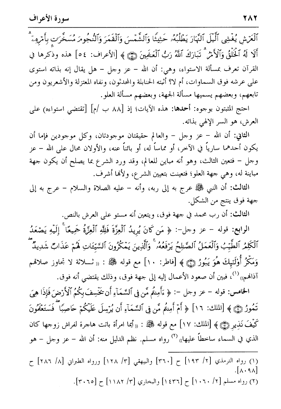 {الْعَرْشِ يُغْشِي اللَّيْلَ النَّهارَ يَطْلُبُهُ حَثِيثاً وَالشَّمْسَ وَالْقَمَرَ وَالنُّجُومَ مُسَخَّراتٍ بِأَمْرِهِ أَلا لَهُ الْخَلْقُ وَالْأَمْرُ تَبارَكَ اللهُ رَبُّ الْعالَمِينَ} (٥٤) [الأعراف: ٥٤] هذه وذكرها في القرآن تعرف بمسألة الاستواء، وهي: أن الله-عز وجل-هل يقال إنه بذاته استوى على عرشه فوق السماوات، أم لا؟ أثبته الحنابلة والمحدثون، ونفاه المعتزلة والأشعريون ومن تابعهم، وبعضهم يسميها مسألة الجهة، وبعضهم مسألة العلو.