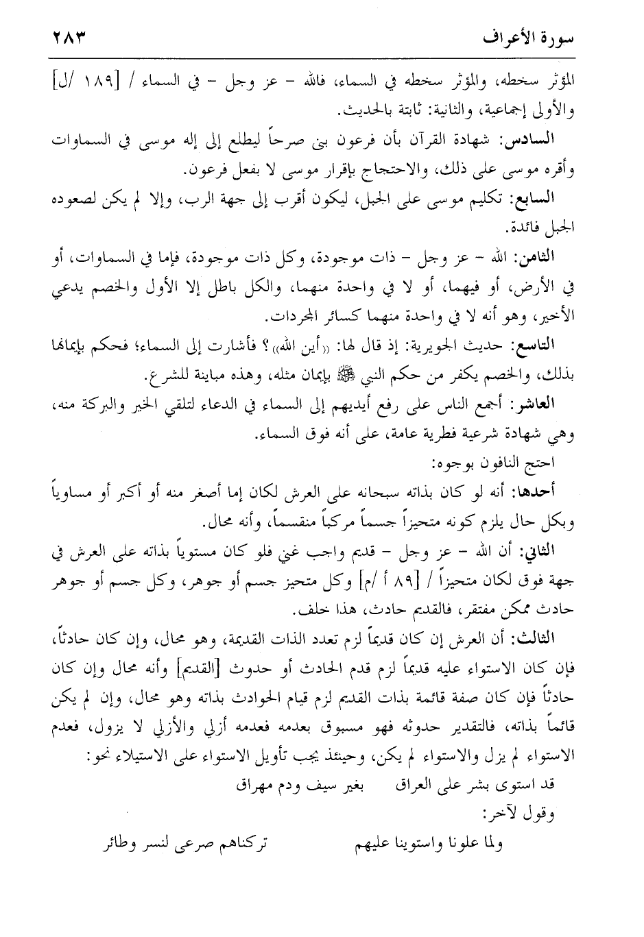 الثالث: أن العرش إن كان قديما لزم تعدد الذات القديمة، وهو محال، وإن كان حادثا، فإن كان الاستواء عليه قديما لزم قدم الحادث أو حدوث [القديم] وأنه محال وإن كان حادثا فإن كان صفة قائمة بذات القديم لزم قيام الحوادث بذاته وهو محال، وإن لم يكن قائما بذاته، فالتقدير حدوثه فهو مسبوق بعدمه فعدمه أزلي والأزلي لا يزول، فعدم الاستواء لم يزل والاستواء لم يكن، وحينئذ يجب تأويل الاستواء على الاستيلاء نحو: