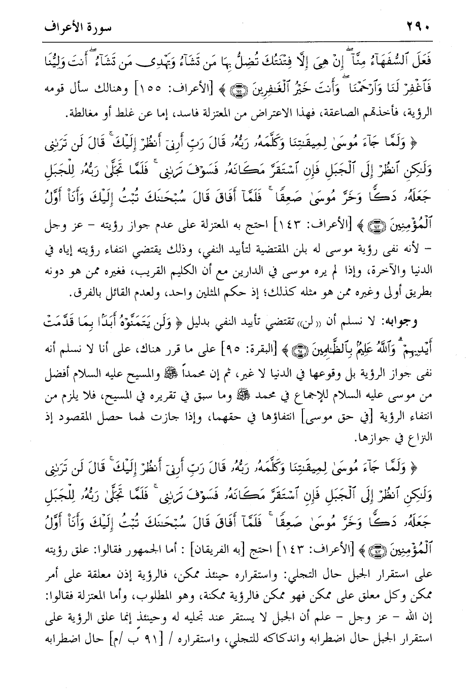 {وَلَمّا جاءَ مُوسى لِمِيقاتِنا وَكَلَّمَهُ رَبُّهُ قالَ رَبِّ أَرِنِي أَنْظُرْ إِلَيْكَ قالَ لَنْ تَرانِي وَلكِنِ اُنْظُرْ إِلَى الْجَبَلِ فَإِنِ اِسْتَقَرَّ مَكانَهُ فَسَوْفَ تَرانِي فَلَمّا تَجَلّى رَبُّهُ لِلْجَبَلِ جَعَلَهُ دَكًّا وَخَرَّ مُوسى صَعِقاً فَلَمّا أَفاقَ قالَ سُبْحانَكَ تُبْتُ إِلَيْكَ وَأَنَا أَوَّلُ الْمُؤْمِنِينَ} (١٤٣) [الأعراف: ١٤٣] احتج [به الفريقان]: أما الجمهور فقالوا: علق رؤيته على استقرار الجبل حال التجلي: واستقراره حينئذ ممكن، فالرؤية إذن معلقة على أمر ممكن وكل معلق على ممكن فهو ممكن فالرؤية ممكنة، وهو المطلوب، وأما المعتزلة فقالوا: