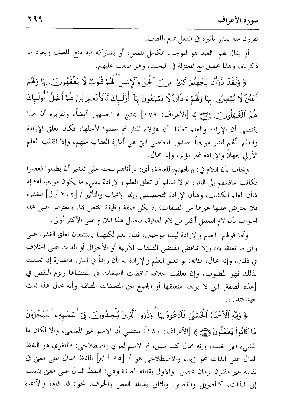 {وَلَقَدْ ذَرَأْنا لِجَهَنَّمَ كَثِيراً مِنَ الْجِنِّ وَالْإِنْسِ لَهُمْ قُلُوبٌ لا يَفْقَهُونَ بِها وَلَهُمْ أَعْيُنٌ لا يُبْصِرُونَ بِها وَلَهُمْ آذانٌ لا يَسْمَعُونَ بِها أُولئِكَ كَالْأَنْعامِ بَلْ هُمْ أَضَلُّ أُولئِكَ هُمُ الْغافِلُونَ} (١٧٩) [الأعراف: ١٧٩] يحتج به الجمهور أيضا، وتقريره أن هذا يقتضي أن الإرادة والعلم تعلقا بأن هؤلاء للنار ثم خلقوا لأجلها، فكان تعلق الإرادة والعلم بأنهم للنار موجبا لصدور المعاصي التي هي أمارة العقاب منهم، وإلا انقلب العلم الأزلي جهلا والإرادة غير مؤثرة وإنه محال.