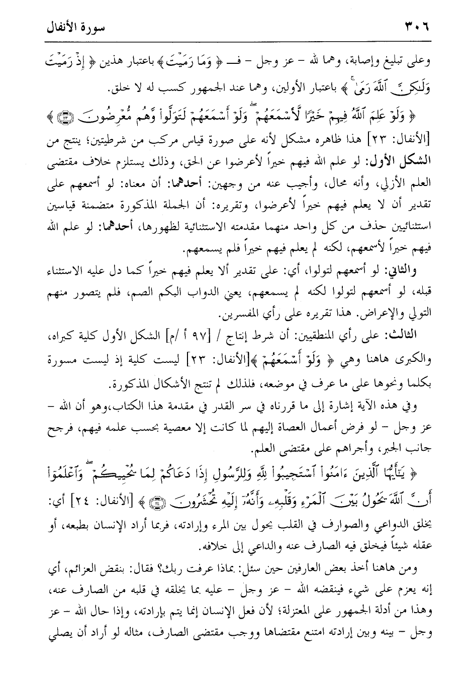 {وَلَوْ عَلِمَ اللهُ فِيهِمْ خَيْراً لَأَسْمَعَهُمْ وَلَوْ أَسْمَعَهُمْ لَتَوَلَّوْا وَهُمْ مُعْرِضُونَ} (٢٣) [الأنفال: ٢٣] هذا ظاهره مشكل لأنه على صورة قياس مركب من شرطيتين؛ ينتج من الشكل الأول: لو علم الله فيهم خيرا لأعرضوا عن الحق، وذلك يستلزم خلاف مقتضى العلم الأزلي، وأنه محال، وأجيب عنه من وجهين: أحدهما: أن معناه: لو أسمعهم على تقدير أن لا يعلم فيهم خيرا لأعرضوا، وتقريره: أن الجملة المذكورة متضمنة قياسين استثنائيين حذف من كل واحد منهما مقدمته الاستثنائية لظهورها، أحدهما: لو علم الله فيهم خيرا لأسمعهم، لكنه لم يعلم فيهم خيرا فلم يسمعهم.