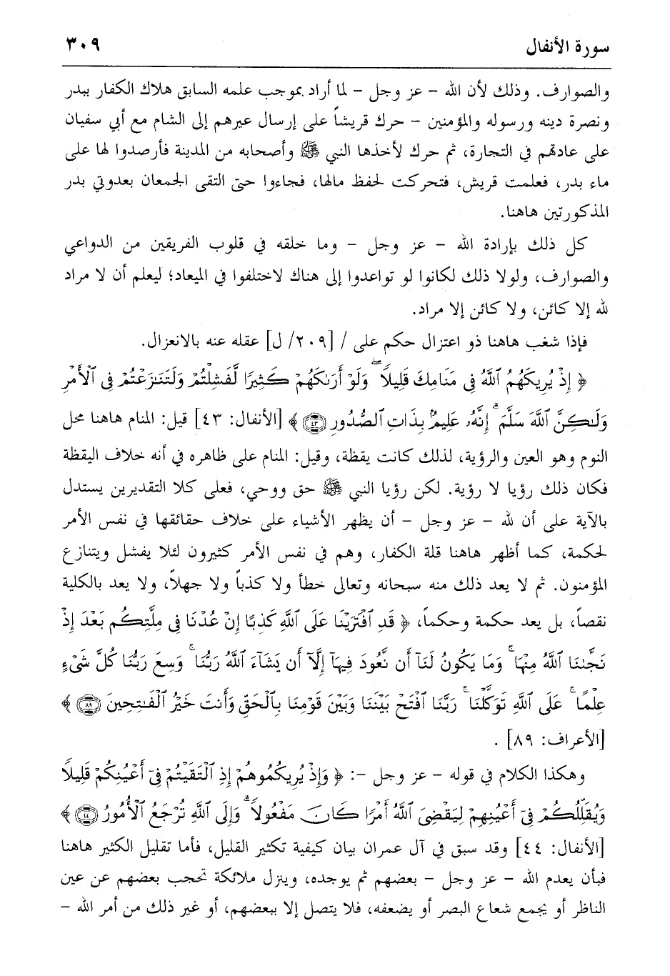 {إِذْ يُرِيكَهُمُ اللهُ فِي مَنامِكَ قَلِيلاً وَلَوْ أَراكَهُمْ كَثِيراً لَفَشِلْتُمْ وَلَتَنازَعْتُمْ فِي الْأَمْرِ وَلكِنَّ اللهَ سَلَّمَ إِنَّهُ عَلِيمٌ بِذاتِ الصُّدُورِ} (٤٣) [الأنفال: ٤٣] قيل: المنام هاهنا محل النوم وهو العين والرؤية، لذلك كانت يقظة، وقيل: المنام على ظاهره في أنه خلاف اليقظة فكان ذلك رؤيا لا رؤية. لكن رؤيا النبي صلّى الله عليه وسلّم حق ووحي، فعلى كلا التقديرين يستدل بالآية على أن لله-عز وجل-أن يظهر الأشياء على خلاف حقائقها في نفس الأمر لحكمة، كما أظهر هاهنا قلة الكفار، وهم في نفس الأمر كثيرون لئلا يفشل ويتنازع المؤمنون. ثم لا يعد ذلك منه سبحانه وتعالى خطأ ولا كذبا ولا جهلا، ولا يعد بالكلية نقصا، بل يعد حكمة وحكما، {قَدِ اِفْتَرَيْنا عَلَى اللهِ كَذِباً إِنْ عُدْنا فِي مِلَّتِكُمْ بَعْدَ إِذْ نَجّانَا اللهُ مِنْها وَما يَكُونُ لَنا أَنْ نَعُودَ فِيها إِلاّ أَنْ يَشاءَ اللهُ رَبُّنا وَسِعَ رَبُّنا كُلَّ شَيْءٍ عِلْماً عَلَى اللهِ تَوَكَّلْنا رَبَّنَا اِفْتَحْ بَيْنَنا وَبَيْنَ قَوْمِنا بِالْحَقِّ وَأَنْتَ خَيْرُ الْفاتِحِينَ} (٨٩) [الأعراف: ٨٩].