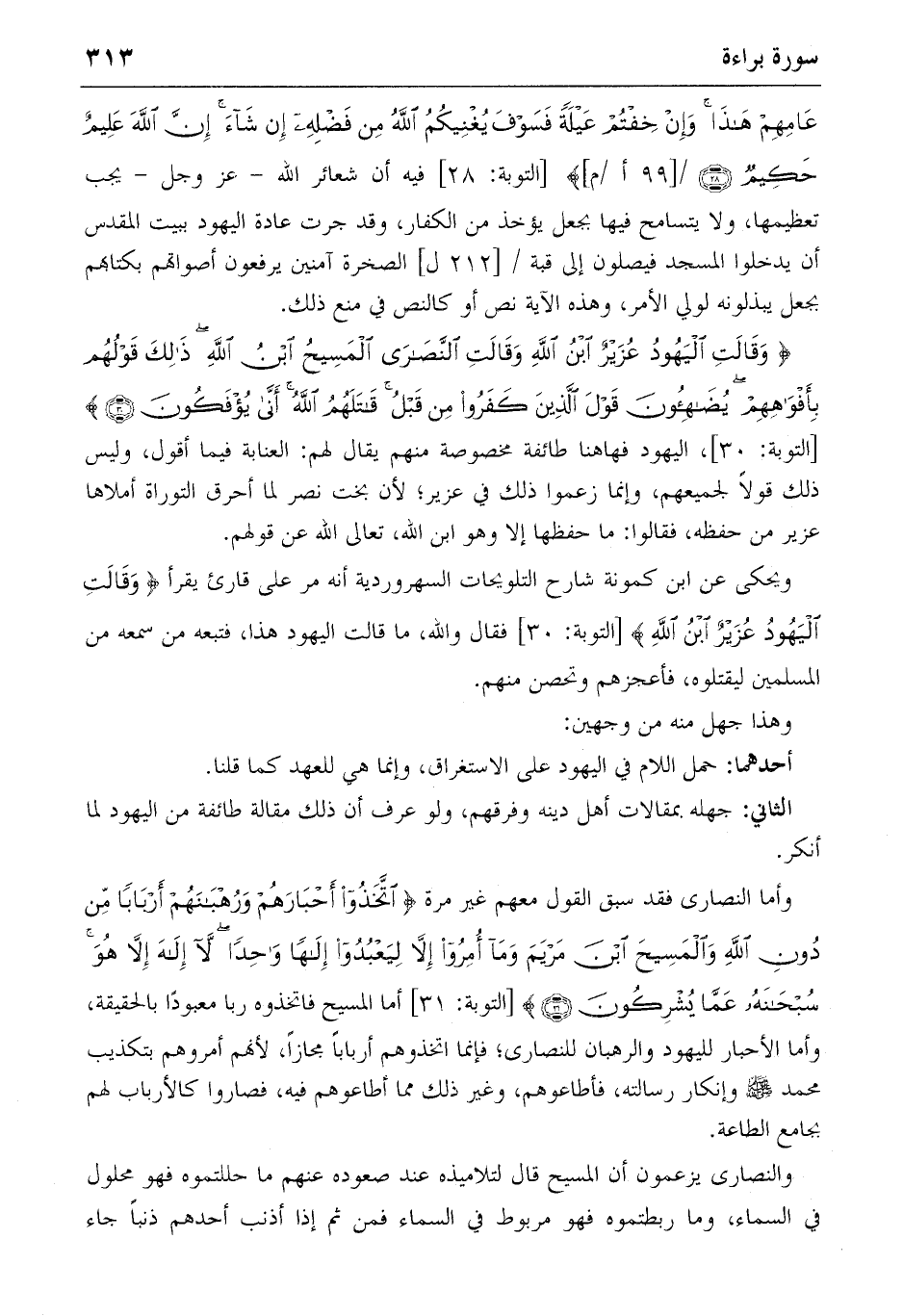 {وَقالَتِ الْيَهُودُ عُزَيْرٌ اِبْنُ اللهِ وَقالَتِ النَّصارى الْمَسِيحُ اِبْنُ اللهِ ذلِكَ قَوْلُهُمْ بِأَفْواهِهِمْ يُضاهِؤُنَ قَوْلَ الَّذِينَ كَفَرُوا مِنْ قَبْلُ قاتَلَهُمُ اللهُ أَنّى يُؤْفَكُونَ} (٣٠) [التوبة: ٣٠]، اليهود فهاهنا طائفة مخصوصة منهم يقال لهم: العنابة فيما أقول، وليس ذلك قولا لجميعهم، وإنما زعموا ذلك في عزير؛ لأن بخت نصر لما أحرق التوراة أملاها عزير من حفظه، فقالوا: ما حفظها إلا وهو ابن الله، تعالى الله عن قولهم.