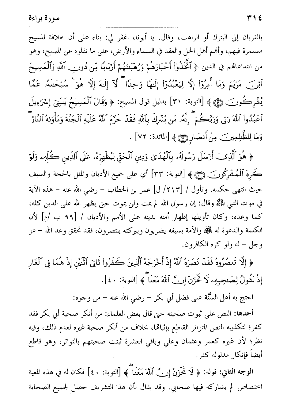 {هُوَ الَّذِي أَرْسَلَ رَسُولَهُ بِالْهُدى وَدِينِ الْحَقِّ لِيُظْهِرَهُ عَلَى الدِّينِ كُلِّهِ وَلَوْ كَرِهَ الْمُشْرِكُونَ} (٣٣) [التوبة: ٣٣] أي على جميع الأديان والملل بالحجة والسيف حيث انتهى حكمه. وتأول/ [٢١٣/ل] عمر بن الخطاب-رضي الله عنه-هذه الآية في موت النبي صلّى الله عليه وسلّم وقال: إن رسول الله لم يمت ولن يموت حتى يظهر الله على الدين كله، كما وعده، وكان تأويلها إظهار أمته بدينه على الأمم والأديان/ [٩٩ ب/م] لأن الكلمة والدعوة له صلّى الله عليه وسلّم والأمة بسيفه يضربون وببركته ينتصرون، فقد تحقق وعد الله-عز وجل-له ولو كره الكافرون.