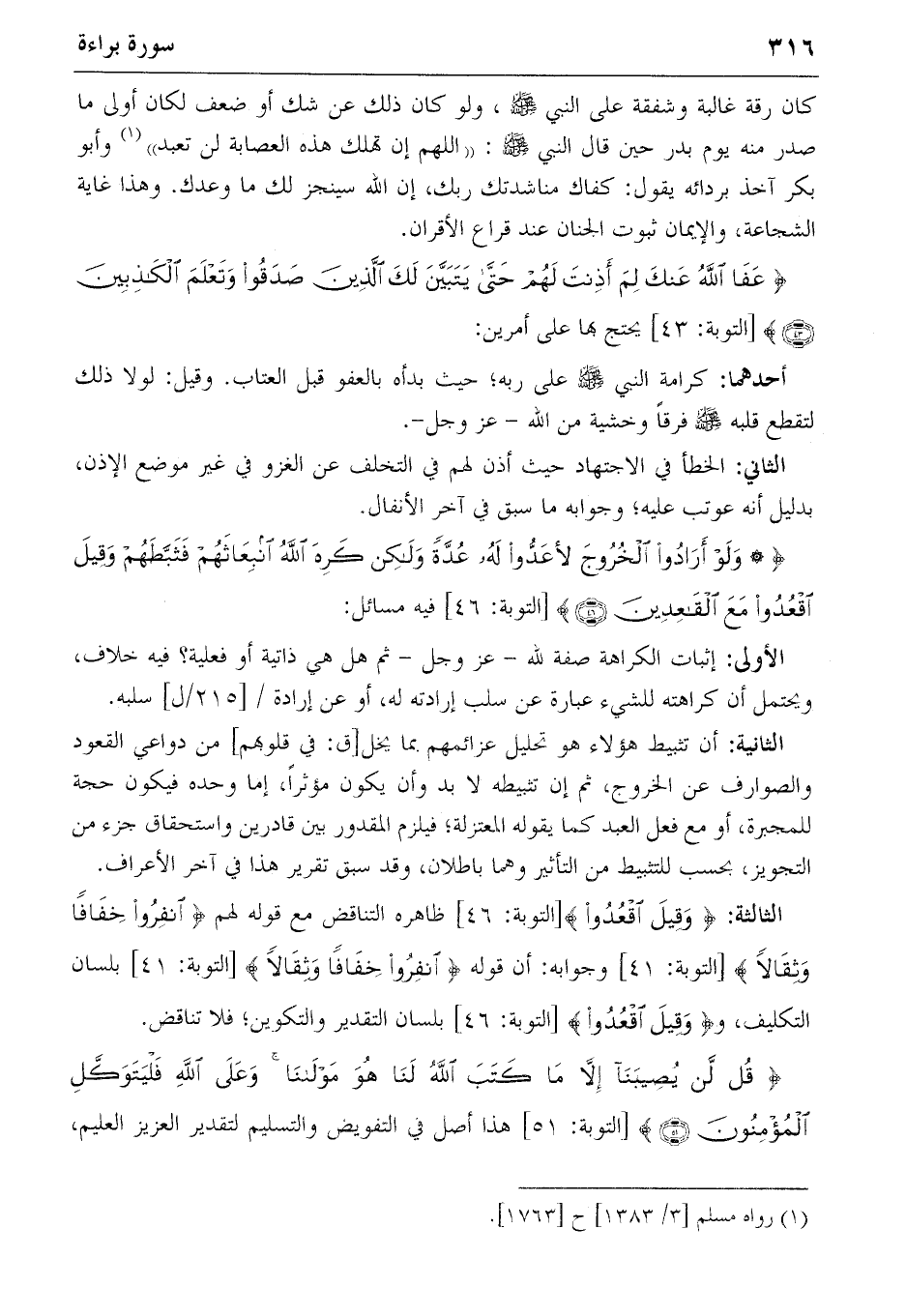 الثالثة: {وَقِيلَ اُقْعُدُوا} [التوبة: ٤٦] ظاهره التناقض مع قوله لهم {اِنْفِرُوا خِفافاً وَثِقالاً} [التوبة: ٤١] وجوابه: أن قوله {اِنْفِرُوا خِفافاً وَثِقالاً} [التوبة: ٤١] بلسان التكليف، و {وَقِيلَ اُقْعُدُوا} [التوبة: ٤٦] بلسان التقدير والتكوين؛ فلا تناقض.