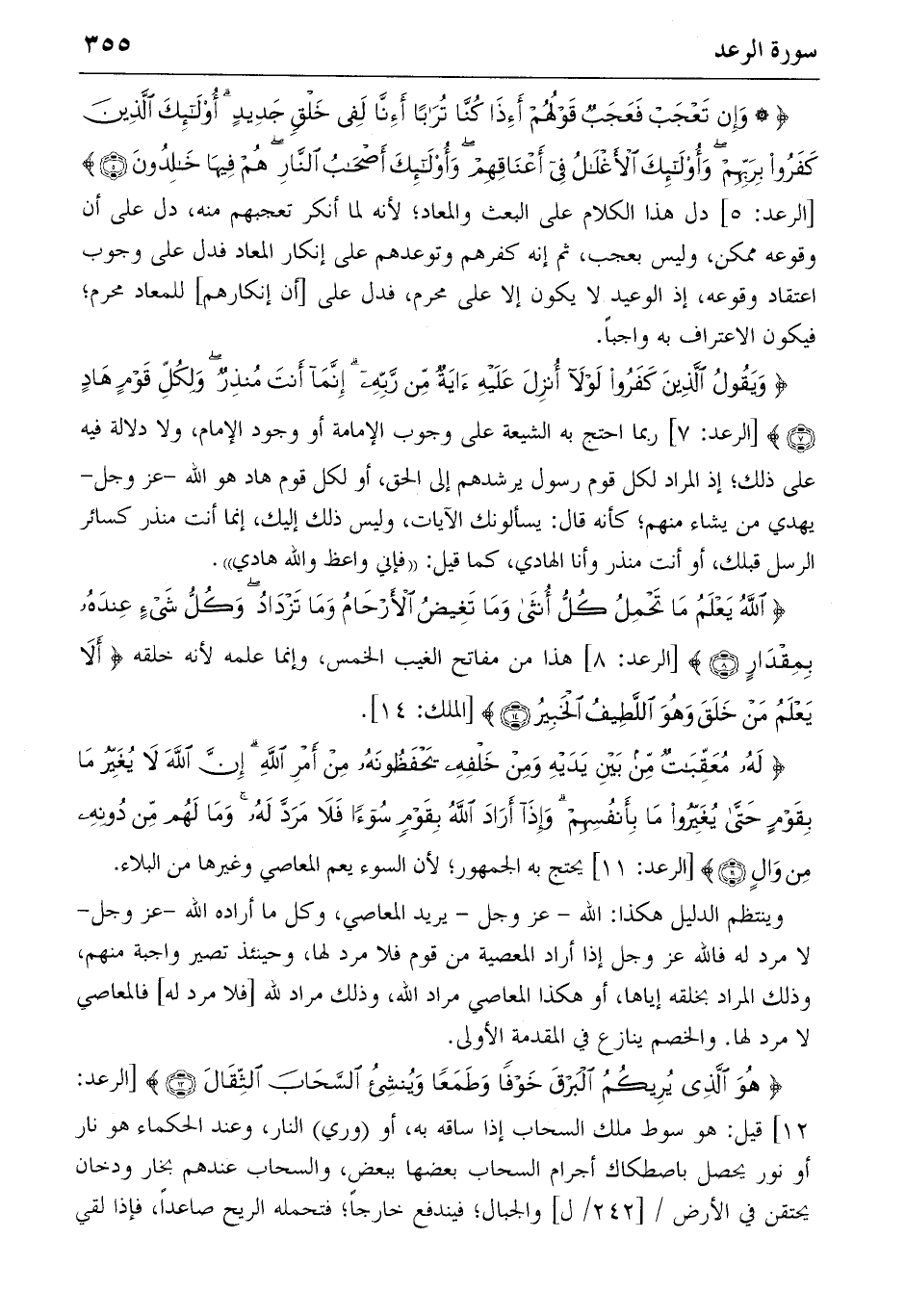 {وَيَقُولُ الَّذِينَ كَفَرُوا لَوْلا أُنْزِلَ عَلَيْهِ آيَةٌ مِنْ رَبِّهِ إِنَّما أَنْتَ مُنْذِرٌ وَلِكُلِّ قَوْمٍ هادٍ} (٧) [الرعد: ٧] ربما احتج به الشيعة على وجوب الإمامة أو وجود الإمام، ولا دلالة فيه على ذلك؛ إذ المراد لكل قوم رسول يرشدهم إلى الحق، أو لكل قوم هاد هو الله-عز وجل- يهدي من يشاء منهم؛ كأنه قال: يسألونك الآيات، وليس ذلك إليك، إنما أنت منذر كسائر الرسل قبلك، أو أنت منذر وأنا الهادي، كما قيل: «فإني واعظ والله هادي».