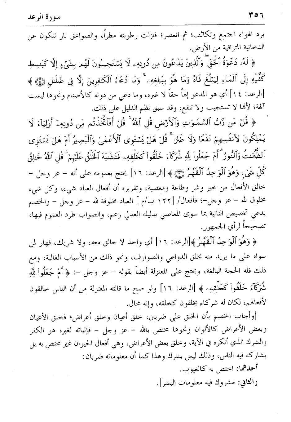 {وَهُوَ الْواحِدُ الْقَهّارُ} [الرعد: ١٦] أي واحد لا خالق معه، ولا شريك، قهار لمن سواه على ما يريد منه بخلق الدواعي والصوارف، ونحو ذلك من الأسباب الغالبة، ومع ذلك فله الحجة البالغة، ويحتج على المعتزلة أيضا بقوله-عز وجل-: {أَمْ جَعَلُوا لِلّهِ شُرَكاءَ خَلَقُوا كَخَلْقِهِ} [الرعد: ١٦] ولو صح ما قالته المعتزلة من أن الناس خالقون لأفعالهم، لكان له شركاء يخلقون كخلقه، وإنه محال.