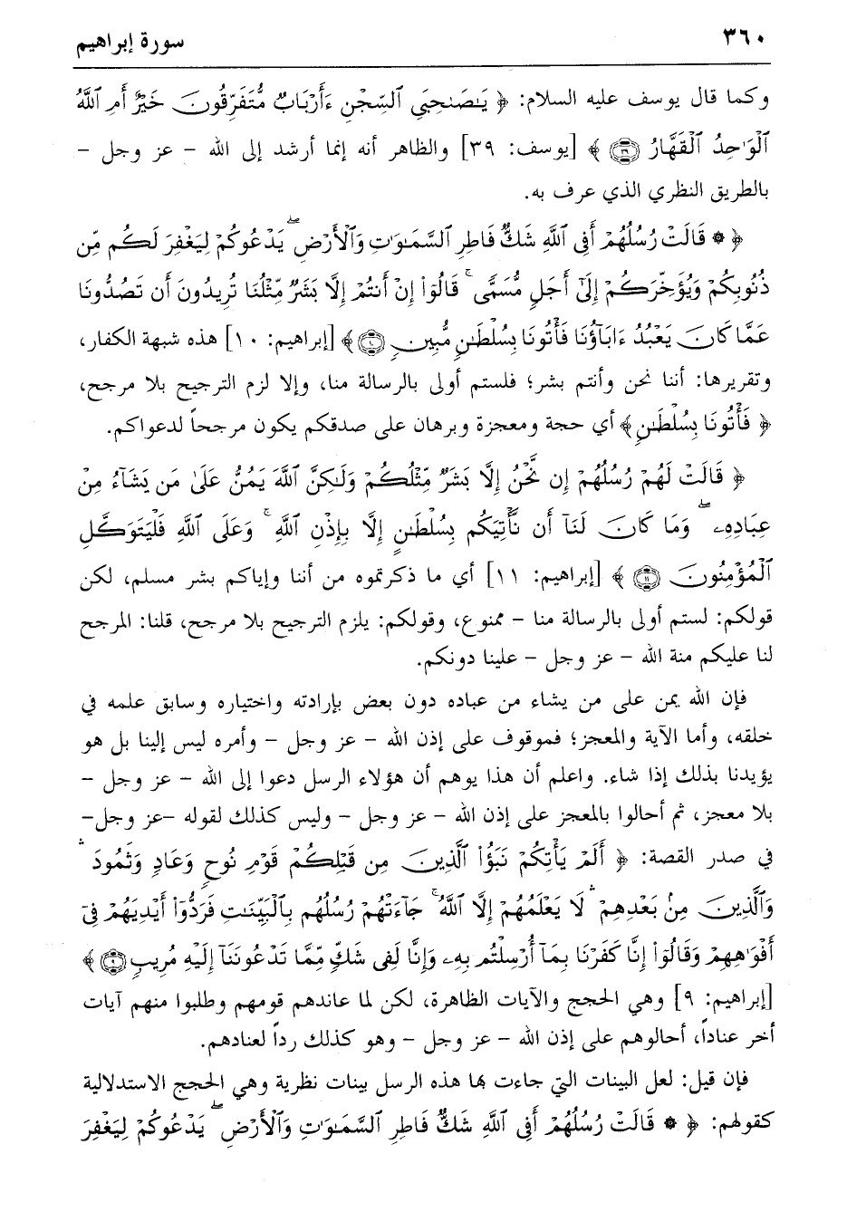 {*قالَتْ رُسُلُهُمْ أَفِي اللهِ شَكٌّ فاطِرِ السَّماواتِ وَالْأَرْضِ يَدْعُوكُمْ لِيَغْفِرَ لَكُمْ مِنْ ذُنُوبِكُمْ وَيُؤَخِّرَكُمْ إِلى أَجَلٍ مُسَمًّى قالُوا إِنْ أَنْتُمْ إِلاّ بَشَرٌ مِثْلُنا تُرِيدُونَ أَنْ تَصُدُّونا عَمّا كانَ يَعْبُدُ آباؤُنا فَأْتُونا بِسُلْطانٍ مُبِينٍ} (١٠) [إبراهيم: ١٠] هذه شبهة الكفار، وتقريرها: أننا نحن وأنتم بشر؛ فلستم أولى بالرسالة منا، وإلا لزم الترجيح بلا مرجح، {فَأْتُونا بِسُلْطانٍ} أي حجة ومعجزة وبرهان على صدقكم يكون مرجحا لدعواكم.