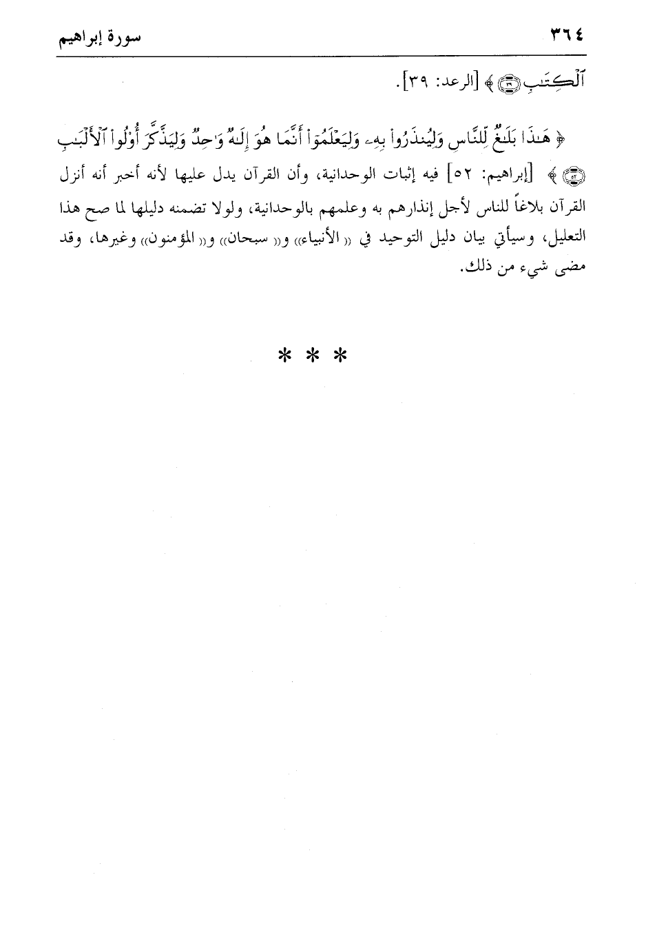 {هذا بَلاغٌ لِلنّاسِ وَلِيُنْذَرُوا بِهِ وَلِيَعْلَمُوا أَنَّما هُوَ إِلهٌ واحِدٌ وَلِيَذَّكَّرَ أُولُوا الْأَلْبابِ} (٥٢) [إبراهيم: ٥٢] فيه إثبات الوحدانية، وأن القرآن يدل عليها لأنه أخبر أنه أنزل القرآن بلاغا للناس لأجل إنذارهم به وعلمهم بالوحدانية، ولولا تضمنه دليلها لما صح هذا التعليل، وسيأتي بيان دليل التوحيد في «الأنبياء» و «سبحان» و «المؤمنون» وغيرها، وقد مضى شيء من ذلك.