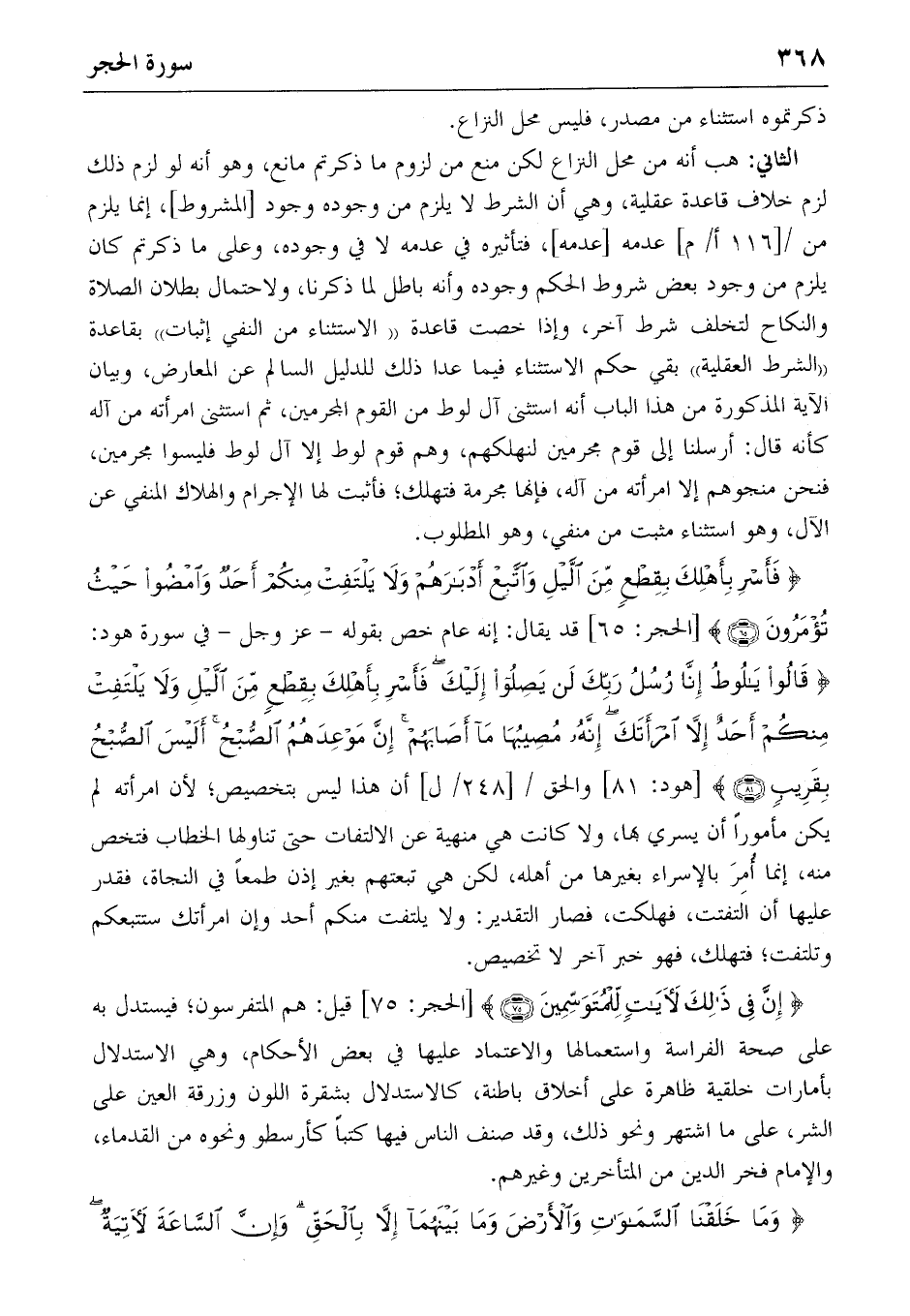الثاني: هب أنه من محل النزاع لكن منع من لزوم ما ذكرتم مانع، وهو أنه لو لزم ذلك لزم خلاف قاعدة عقلية، وهي أن الشرط لا يلزم من وجوده وجود [المشروط]، إنما يلزم من/ [١١٦ أ/م] عدمه [عدمه]، فتأثيره في عدمه لا في وجوده، وعلى ما ذكرتم كان يلزم من وجود بعض شروط الحكم وجوده وأنه باطل لما ذكرنا، ولاحتمال بطلان الصلاة والنكاح لتخلف شرط آخر، وإذا خصت قاعدة «الاستثناء من النفي إثبات» بقاعدة «الشرط العقلية» بقي حكم الاستثناء فيما عدا ذلك للدليل السالم عن المعارض، وبيان الآية المذكورة من هذا الباب أنه استثنى آل لوط من القوم المجرمين، ثم استثنى امرأته من آله كأنه قال: أرسلنا إلى قوم مجرمين لنهلكهم، وهم قوم لوط إلا آل لوط فليسوا مجرمين، فنحن منجوهم إلا امرأته من آله، فإنها مجرمة فتهلك؛ فأثبت لها الإجرام والهلاك المنفي عن الآل، وهو استثناء مثبت من منفي، وهو المطلوب.