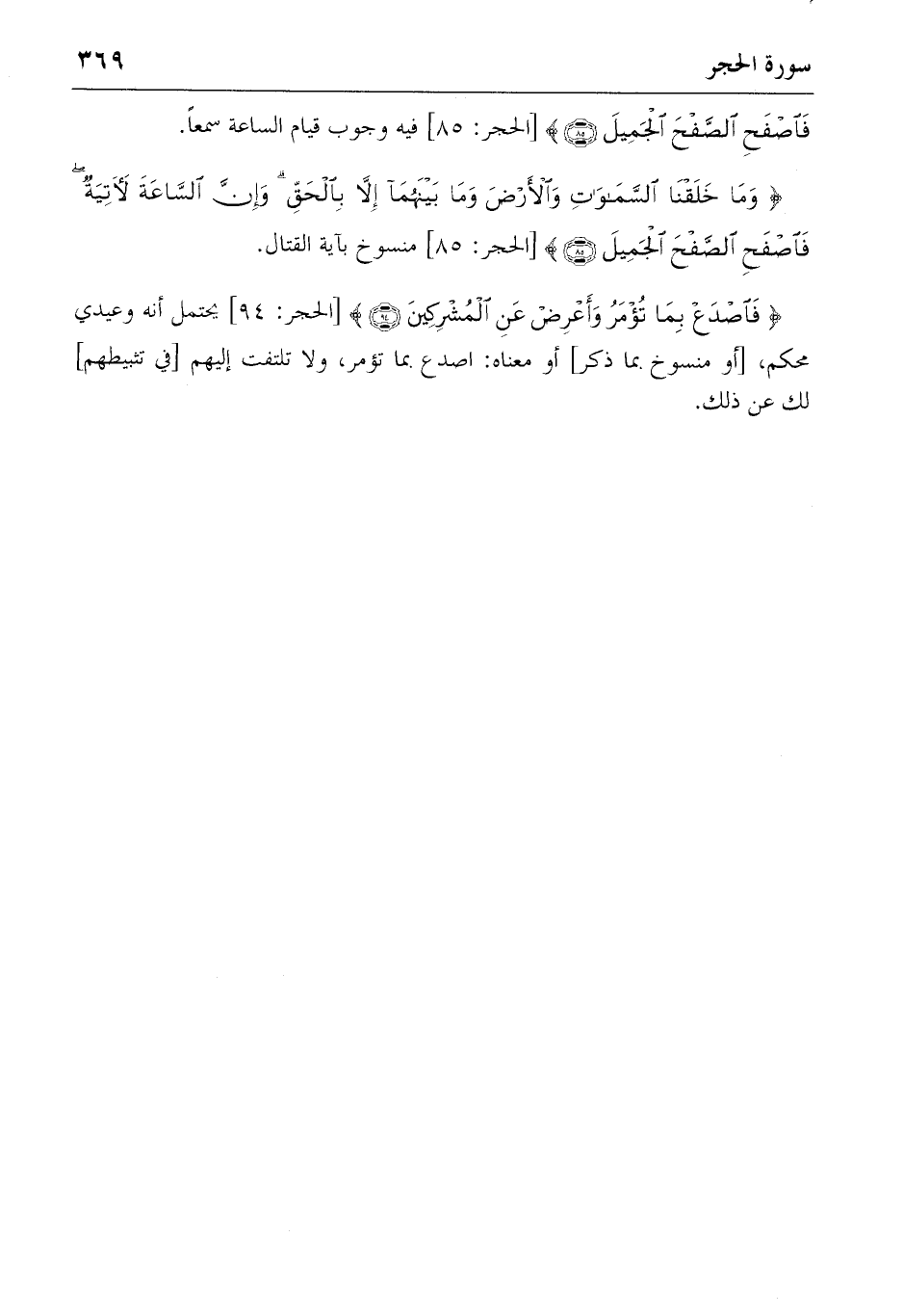 {فَاصْدَعْ بِما تُؤْمَرُ وَأَعْرِضْ عَنِ الْمُشْرِكِينَ} (٩٤) [الحجر: ٩٤] يحتمل أنه وعيدي محكم، [أو منسوخ بما ذكر] أو معناه: اصدع بما تؤمر، ولا تلتفت إليهم [في تثبيطهم] لك عن ذلك.