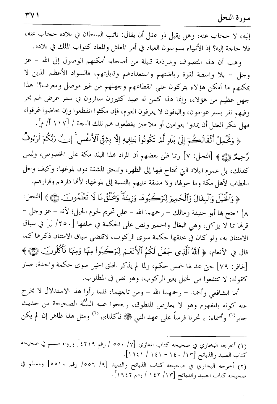 {وَتَحْمِلُ أَثْقالَكُمْ إِلى بَلَدٍ لَمْ تَكُونُوا بالِغِيهِ إِلاّ بِشِقِّ الْأَنْفُسِ إِنَّ رَبَّكُمْ لَرَؤُفٌ رَحِيمٌ} (٧) [النحل: ٧] ربما ظن بعضهم أن المراد بهذا البلد مكة على الخصوص، وليس كذلك، بل عموم البلاد التي تحتاج فيها إلى الظهر، وتلحق المشقة دون بلوغها، وكيف ولعل الخطاب لأهل مكة وما حولها، ولا مشقة عليهم بالنسبة إلى بلوغها، لأنها دارهم وقرارهم.