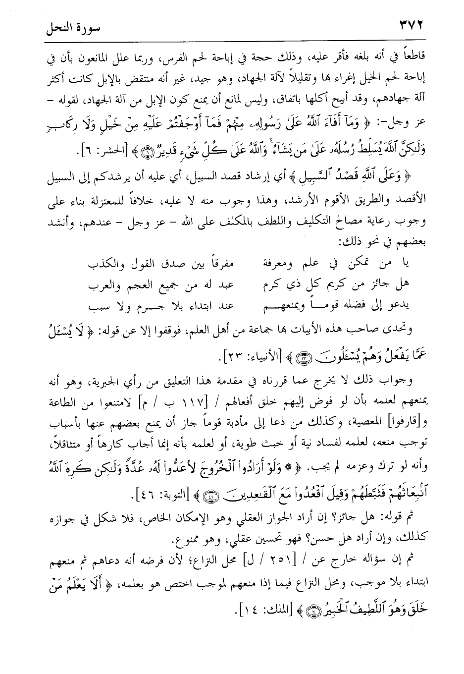 {وَعَلَى اللهِ قَصْدُ السَّبِيلِ} أي إرشاد قصد السبيل، أي عليه أن يرشدكم إلى السبيل الأقصد والطريق الأقوم الأرشد، وهذا وجوب منه لا عليه، خلافا للمعتزلة بناء على وجوب رعاية مصالح التكليف واللطف بالمكلف على الله-عز وجل-عندهم، وأنشد بعضهم في نحو ذلك: