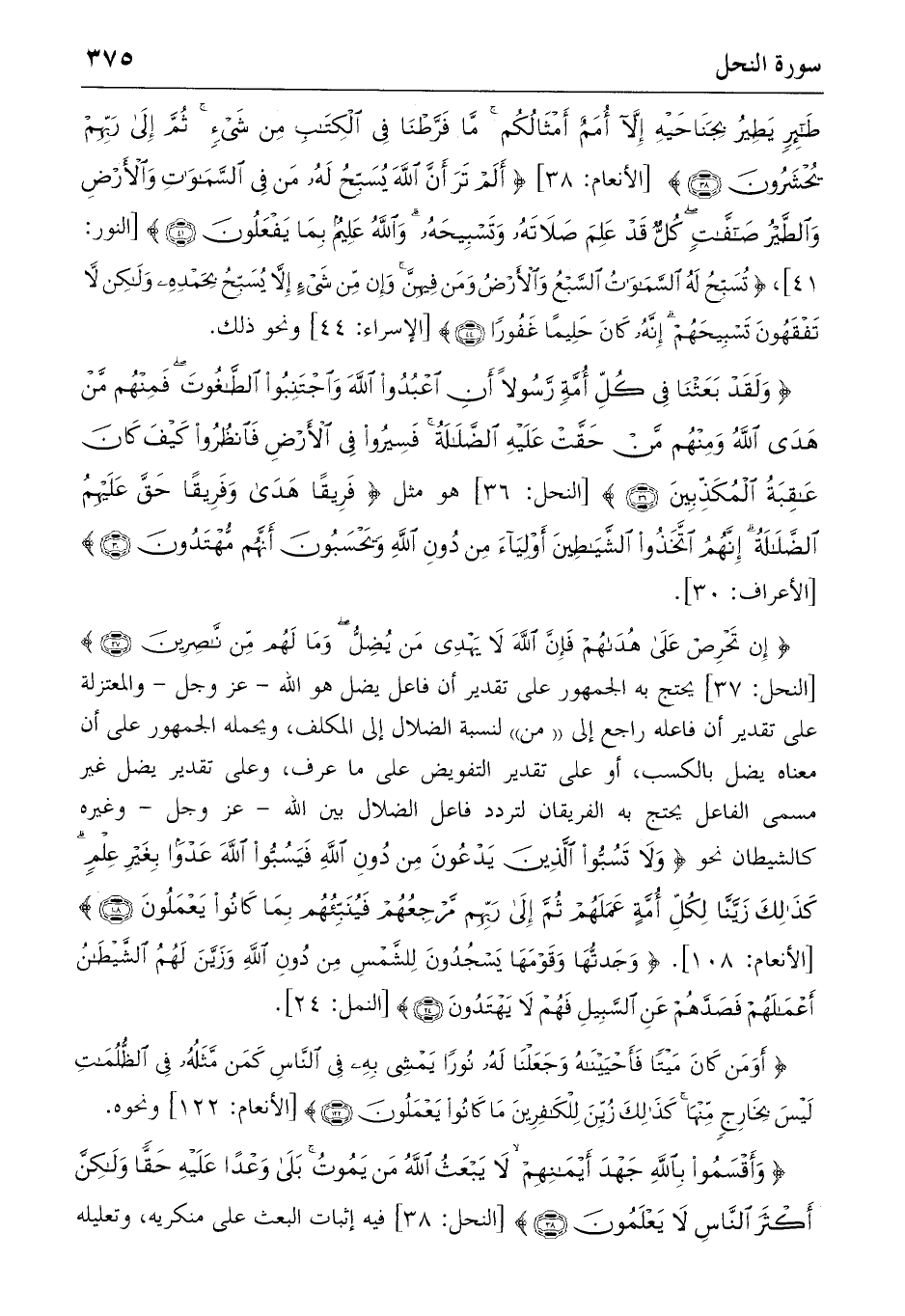 {إِنْ تَحْرِصْ عَلى هُداهُمْ فَإِنَّ اللهَ لا يَهْدِي مَنْ يُضِلُّ وَما لَهُمْ مِنْ ناصِرِينَ} (٣٧) [النحل: ٣٧] يحتج به الجمهور على تقدير أن فاعل يضل هو الله-عز وجل-والمعتزلة على تقدير أن فاعله راجع إلى «من» لنسبة الضلال إلى المكلف، ويحمله الجمهور على أن معناه يضل بالكسب، أو على تقدير التفويض على ما عرف، وعلى تقدير يضل غير مسمى الفاعل يحتج به الفريقان لتردد فاعل الضلال بين الله-عز وجل-وغيره كالشيطان نحو {وَلا تَسُبُّوا الَّذِينَ يَدْعُونَ مِنْ دُونِ اللهِ فَيَسُبُّوا اللهَ عَدْواً بِغَيْرِ عِلْمٍ كَذلِكَ زَيَّنّا لِكُلِّ أُمَّةٍ عَمَلَهُمْ ثُمَّ إِلى رَبِّهِمْ مَرْجِعُهُمْ فَيُنَبِّئُهُمْ بِما كانُوا يَعْمَلُونَ} (١٠٨) [الأنعام: ١٠٨]. {وَجَدْتُها وَقَوْمَها يَسْجُدُونَ لِلشَّمْسِ مِنْ دُونِ اللهِ وَزَيَّنَ لَهُمُ الشَّيْطانُ أَعْمالَهُمْ فَصَدَّهُمْ عَنِ السَّبِيلِ فَهُمْ لا يَهْتَدُونَ} (٢٤) [النمل: ٢٤].