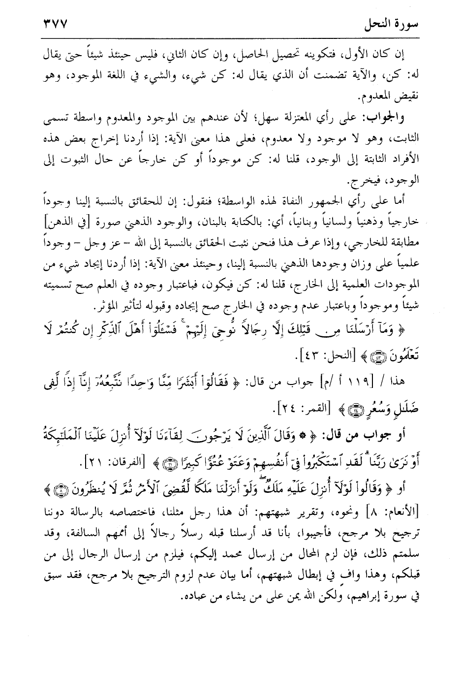 أو {وَقالُوا لَوْلا أُنْزِلَ عَلَيْهِ مَلَكٌ وَلَوْ أَنْزَلْنا مَلَكاً لَقُضِيَ الْأَمْرُ ثُمَّ لا يُنْظَرُونَ} (٨) [الأنعام: ٨] ونحوه، وتقرير شبهتهم: أن هذا رجل مثلنا، فاختصاصه بالرسالة دوننا ترجيح بلا مرجح، فأجيبوا، بأنا قد أرسلنا قبله رسلا رجالا إلى أممهم السالفة، وقد سلمتم ذلك، فإن لزم المحال من إرسال محمد إليكم، فيلزم من إرسال الرجال إلى من قبلكم، وهذا واف في إبطال شبهتهم، أما بيان عدم لزوم الترجيح بلا مرجح، فقد سبق في سورة إبراهيم، ولكن الله يمن على من يشاء من عباده.