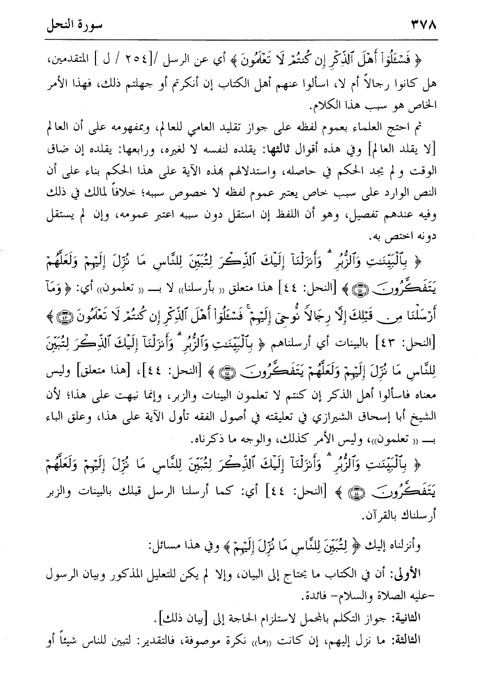 {بِالْبَيِّناتِ وَالزُّبُرِ وَأَنْزَلْنا إِلَيْكَ الذِّكْرَ لِتُبَيِّنَ لِلنّاسِ ما نُزِّلَ إِلَيْهِمْ وَلَعَلَّهُمْ يَتَفَكَّرُونَ} (٤٤) [النحل: ٤٤] هذا متعلق «بأرسلنا» لا ب «تعلمون» أي: {وَما أَرْسَلْنا مِنْ قَبْلِكَ إِلاّ رِجالاً نُوحِي إِلَيْهِمْ فَسْئَلُوا أَهْلَ الذِّكْرِ إِنْ كُنْتُمْ لا تَعْلَمُونَ} (٤٣) [النحل: ٤٣] بالبينات أي أرسلناهم {بِالْبَيِّناتِ وَالزُّبُرِ وَأَنْزَلْنا إِلَيْكَ الذِّكْرَ لِتُبَيِّنَ لِلنّاسِ ما نُزِّلَ إِلَيْهِمْ وَلَعَلَّهُمْ يَتَفَكَّرُونَ} (٤٤) [النحل: ٤٤]، [هذا متعلق] وليس معناه فاسألوا أهل الذكر إن كنتم لا تعلمون البينات والزبر، وإنما نبهت على هذا؛ لأن الشيخ أبا إسحاق الشيرازي في تعليقته في أصول الفقه تأول الآية على هذا، وعلق الباء ب «تعلمون»، وليس الأمر كذلك، والوجه ما ذكرناه.