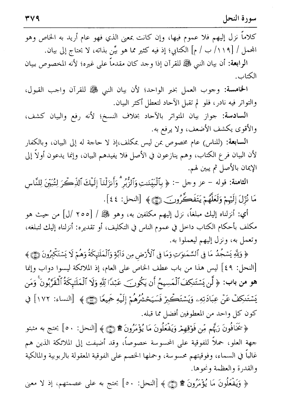 {يَخافُونَ رَبَّهُمْ مِنْ فَوْقِهِمْ وَيَفْعَلُونَ ما يُؤْمَرُونَ} (٥٠) [النحل: ٥٠] يحتج به مثبتو جهة العلو، حملا للفوقية على المحسوسة خصوصا، وقد أضيفت إلى الملائكة الذين هم غالبا في السماء، وفوقيتهم محسوسة، وحملها الخصم على الفوقية المعقولة بالربوبية والمالكية والقدرة والعظمة ونحوها.