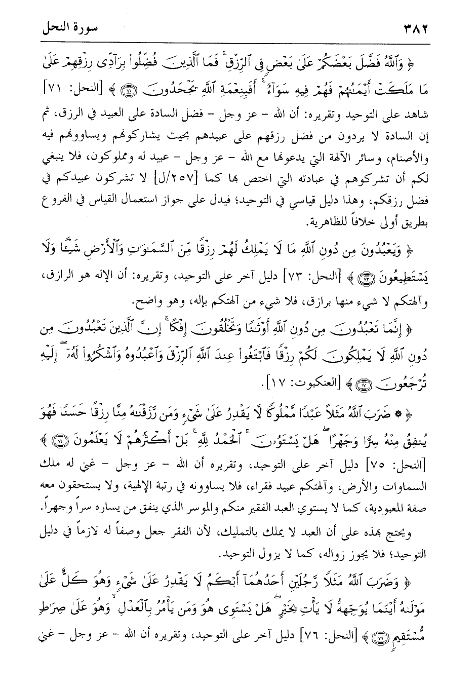 {وَاللهُ فَضَّلَ بَعْضَكُمْ عَلى بَعْضٍ فِي الرِّزْقِ فَمَا الَّذِينَ فُضِّلُوا بِرَادِّي رِزْقِهِمْ عَلى ما مَلَكَتْ أَيْمانُهُمْ فَهُمْ فِيهِ سَواءٌ أَفَبِنِعْمَةِ اللهِ يَجْحَدُونَ} (٧١) [النحل: ٧١] شاهد على التوحيد وتقريره: أن الله-عز وجل-فضل السادة على العبيد في الرزق، ثم إن السادة لا يردون من فضل رزقهم على عبيدهم بحيث يشاركونهم ويساوونهم فيه والأصنام، وسائر الآلهة التي يدعونها مع الله-عز وجل-عبيد له ومملوكون، فلا ينبغي لكم أن تشركوهم في عبادته التي اختص بها كما [٢٥٧/ل] لا تشركون عبيدكم في فضل رزقكم، وهذا دليل قياسي في التوحيد؛ فيدل على جواز استعمال القياس في الفروع بطريق أولى خلافا للظاهرية.