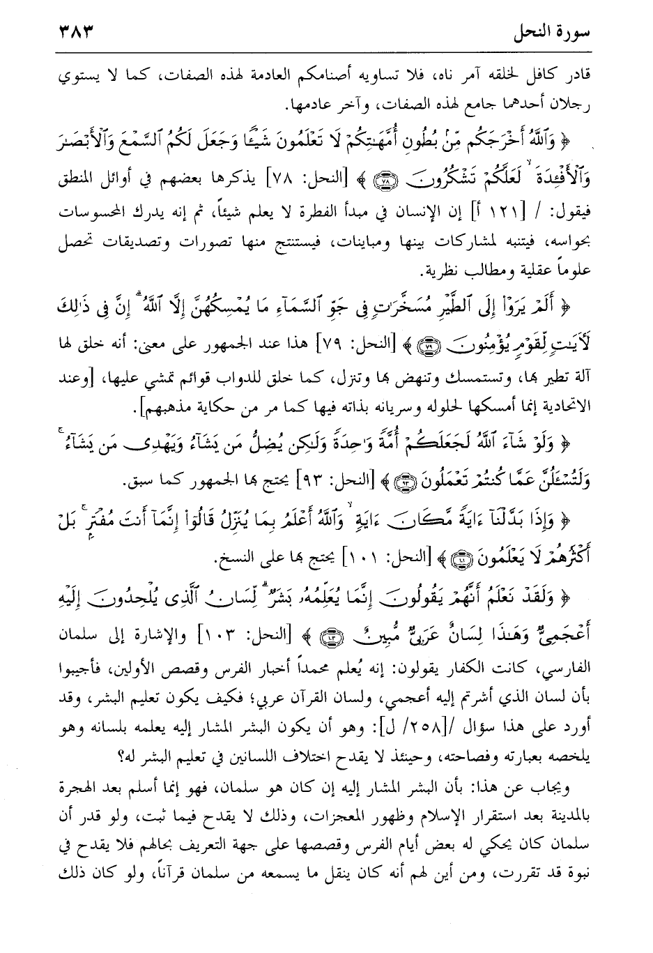{وَلَقَدْ نَعْلَمُ أَنَّهُمْ يَقُولُونَ إِنَّما يُعَلِّمُهُ بَشَرٌ لِسانُ الَّذِي يُلْحِدُونَ إِلَيْهِ أَعْجَمِيٌّ وَهذا لِسانٌ عَرَبِيٌّ مُبِينٌ} (١٠٣) [النحل: ١٠٣] والإشارة إلى سلمان الفارسي، كانت الكفار يقولون: إنه يعلم محمدا أخبار الفرس وقصص الأولين، فأجيبوا بأن لسان الذي أشرتم إليه أعجمي، ولسان القرآن عربي؛ فكيف يكون تعليم البشر، وقد أورد على هذا سؤال/ [٢٥٨/ل]: وهو أن يكون البشر المشار إليه يعلمه بلسانه وهو يلخصه بعبارته وفصاحته، وحينئذ لا يقدح اختلاف اللسانين في تعليم البشر له؟