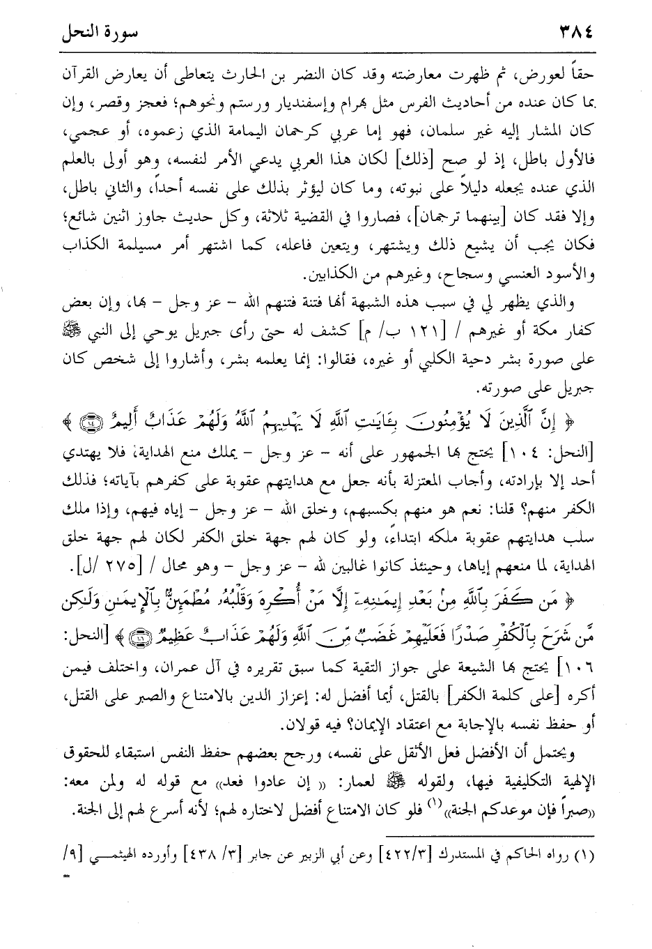 ١٠٦] يحتج بها الشيعة على جواز التقية كما سبق تقريره في آل عمران، واختلف فيمن أكره [على كلمة الكفر] بالقتل، أيما أفضل له: إعزاز الدين بالامتناع والصبر على القتل، أو حفظ نفسه بالإجابة مع اعتقاد الإيمان؟ فيه قولان.