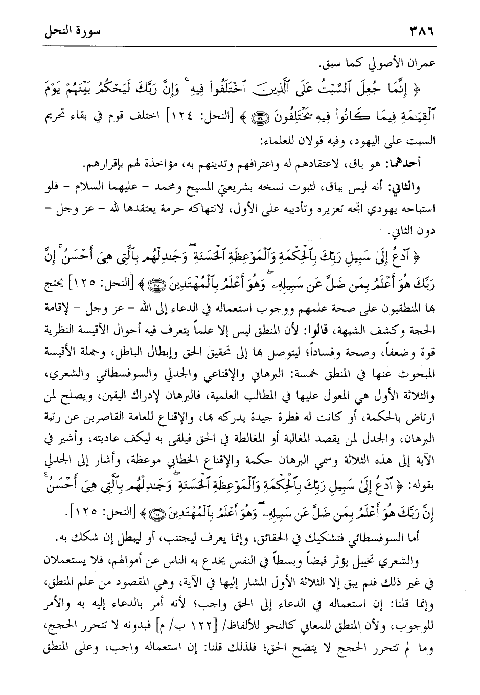 {اُدْعُ إِلى سَبِيلِ رَبِّكَ بِالْحِكْمَةِ وَالْمَوْعِظَةِ الْحَسَنَةِ وَجادِلْهُمْ بِالَّتِي هِيَ أَحْسَنُ إِنَّ رَبَّكَ هُوَ أَعْلَمُ بِمَنْ ضَلَّ عَنْ سَبِيلِهِ وَهُوَ أَعْلَمُ بِالْمُهْتَدِينَ} (١٢٥) [النحل: ١٢٥] يحتج بها المنطقيون على صحة علمهم ووجوب استعماله في الدعاء إلى الله-عز وجل-لإقامة الحجة وكشف الشبهة، قالوا: لأن المنطق ليس إلا علما يتعرف فيه أحوال الأقيسة النظرية قوة وضعفا، وصحة وفسادا؛ ليتوصل بها إلى تحقيق الحق وإبطال الباطل، وجملة الأقيسة المبحوث عنها في المنطق خمسة: البرهاني والإقناعي والجدلي والسوفسطائي والشعري، والثلاثة الأول هي المعول عليها في المطالب العلمية، فالبرهان لإدراك اليقين، ويصلح لمن ارتاض بالحكمة، أو كانت له فطرة جيدة يدركه بها، والإقناع للعامة القاصرين عن رتبة البرهان، والجدل لمن يقصد المغالبة أو المغالطة في الحق فيلقى به ليكف عاديته، وأشير في الآية إلى هذه الثلاثة وسمي البرهان حكمة والإقناع الخطابي موعظة، وأشار إلى الجدلي بقوله: {اُدْعُ إِلى سَبِيلِ رَبِّكَ بِالْحِكْمَةِ وَالْمَوْعِظَةِ الْحَسَنَةِ وَجادِلْهُمْ بِالَّتِي هِيَ أَحْسَنُ إِنَّ رَبَّكَ هُوَ أَعْلَمُ بِمَنْ ضَلَّ عَنْ سَبِيلِهِ وَهُوَ أَعْلَمُ بِالْمُهْتَدِينَ} (١٢٥) [النحل: ١٢٥].