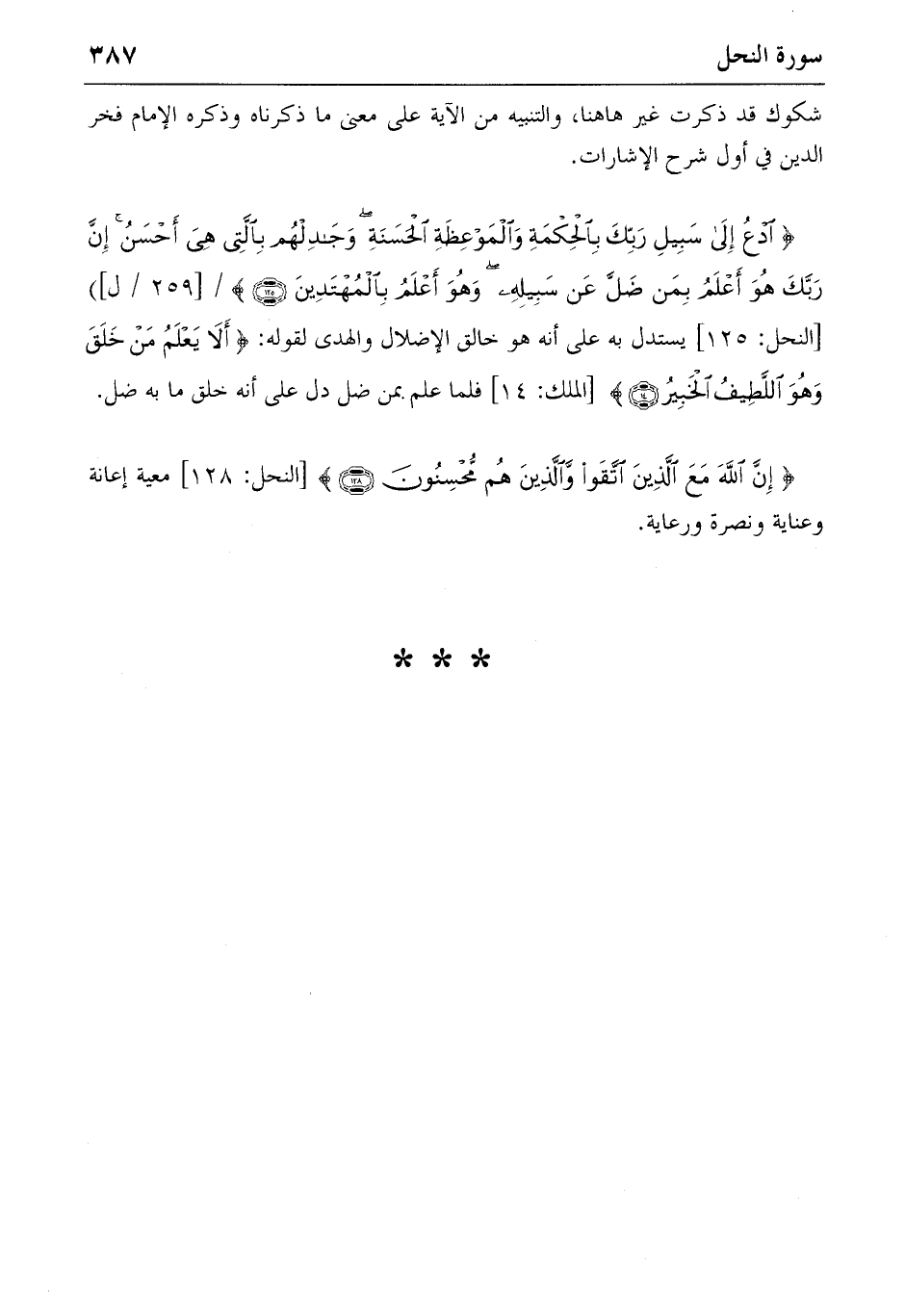 {اُدْعُ إِلى سَبِيلِ رَبِّكَ بِالْحِكْمَةِ وَالْمَوْعِظَةِ الْحَسَنَةِ وَجادِلْهُمْ بِالَّتِي هِيَ أَحْسَنُ إِنَّ رَبَّكَ هُوَ أَعْلَمُ بِمَنْ ضَلَّ عَنْ سَبِيلِهِ وَهُوَ أَعْلَمُ بِالْمُهْتَدِينَ} (١٢٥) / [٢٥٩/ل]) [النحل: ١٢٥] يستدل به على أنه هو خالق الإضلال والهدى لقوله: {أَلا يَعْلَمُ مَنْ خَلَقَ وَهُوَ اللَّطِيفُ الْخَبِيرُ} (١٤) [الملك: ١٤] فلما علم بمن ضل دل على أنه خلق ما به ضل.