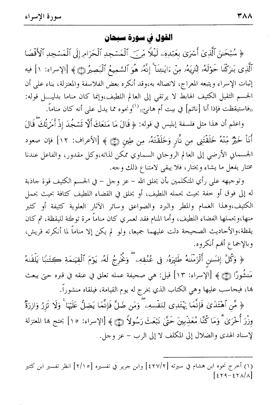 {سُبْحانَ الَّذِي أَسْرى بِعَبْدِهِ لَيْلاً مِنَ الْمَسْجِدِ الْحَرامِ إِلَى الْمَسْجِدِ الْأَقْصَى الَّذِي بارَكْنا حَوْلَهُ لِنُرِيَهُ مِنْ آياتِنا إِنَّهُ هُوَ السَّمِيعُ الْبَصِيرُ} (١) [الإسراء: ١] فيه إثبات الإسراء ويتبعه المعراج، لاتصاله به، وقد أنكره بعض الفلاسفة والمعتزلة، بناء على أن الجسم الثقيل الكثيف الهابط لا يرتقي إلى العالم اللطيف، وإنما كان مناما بدليل قوله: