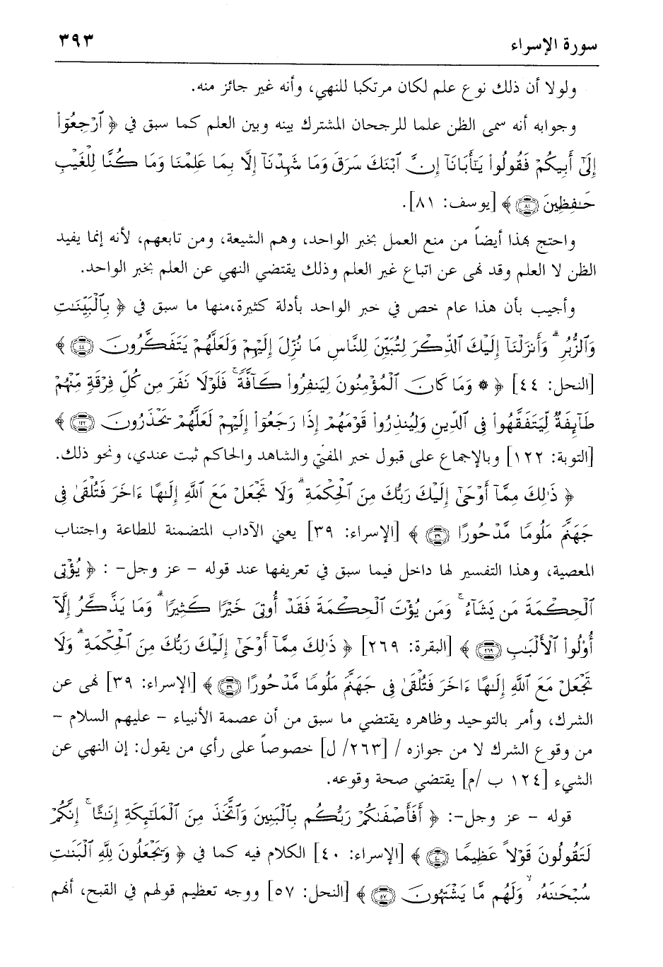 {ذلِكَ مِمّا أَوْحى إِلَيْكَ رَبُّكَ مِنَ الْحِكْمَةِ وَلا تَجْعَلْ مَعَ اللهِ إِلهاً آخَرَ فَتُلْقى فِي جَهَنَّمَ مَلُوماً مَدْحُوراً} (٣٩) [الإسراء: ٣٩] يعني الآداب المتضمنة للطاعة واجتناب المعصية، وهذا التفسير لها داخل فيما سبق في تعريفها عند قوله-عز وجل-: {يُؤْتِي الْحِكْمَةَ مَنْ يَشاءُ وَمَنْ يُؤْتَ الْحِكْمَةَ فَقَدْ أُوتِيَ خَيْراً كَثِيراً وَما يَذَّكَّرُ إِلاّ أُولُوا الْأَلْبابِ} (٢٦٩) [البقرة: ٢٦٩] {ذلِكَ مِمّا أَوْحى إِلَيْكَ رَبُّكَ مِنَ الْحِكْمَةِ وَلا تَجْعَلْ مَعَ اللهِ إِلهاً آخَرَ فَتُلْقى فِي جَهَنَّمَ مَلُوماً مَدْحُوراً} (٣٩) [الإسراء: ٣٩] نهى عن الشرك، وأمر بالتوحيد وظاهره يقتضي ما سبق من أن عصمة الأنبياء-عليهم السّلام- من وقوع الشرك لا من جوازه/ [٢٦٣/ل] خصوصا على رأي من يقول: إن النهي عن الشيء [١٢٤ ب/م] يقتضي صحة وقوعه.
