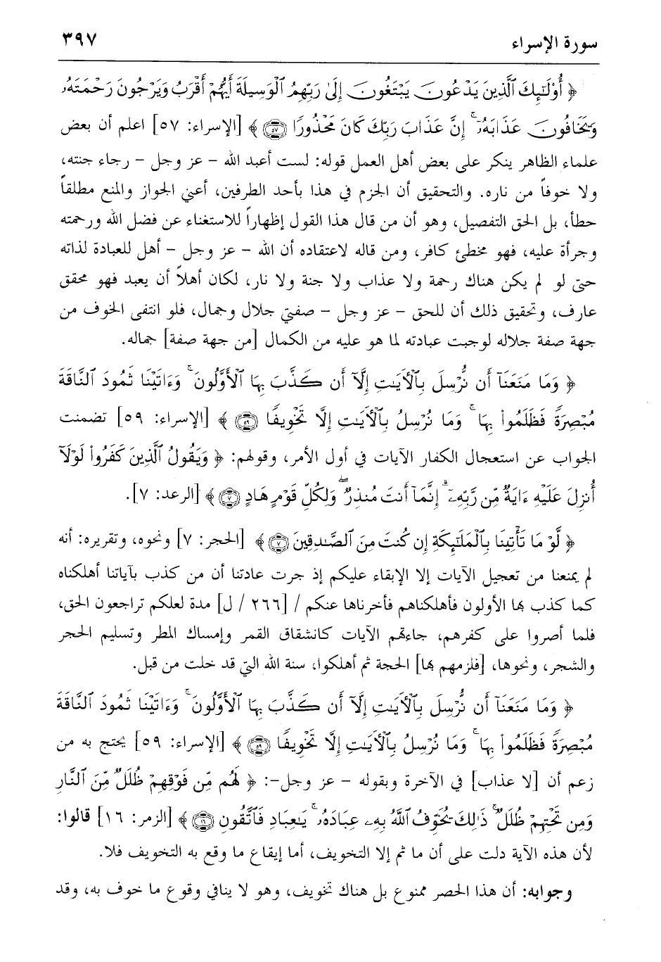 {وَما مَنَعَنا أَنْ نُرْسِلَ بِالْآياتِ إِلاّ أَنْ كَذَّبَ بِهَا الْأَوَّلُونَ وَآتَيْنا ثَمُودَ النّاقَةَ مُبْصِرَةً فَظَلَمُوا بِها وَما نُرْسِلُ بِالْآياتِ إِلاّ تَخْوِيفاً} (٥٩) [الإسراء: ٥٩] يحتج به من زعم أن [لا عذاب] في الآخرة وبقوله-عز وجل-: {لَهُمْ مِنْ فَوْقِهِمْ ظُلَلٌ مِنَ النّارِ وَمِنْ تَحْتِهِمْ ظُلَلٌ ذلِكَ يُخَوِّفُ اللهُ بِهِ عِبادَهُ يا عِبادِ فَاتَّقُونِ} (١٦) [الزمر: ١٦] قالوا:
