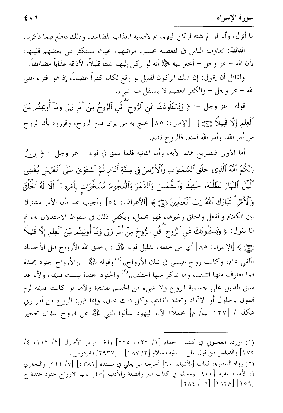 قوله-عز وجل-: {وَيَسْئَلُونَكَ عَنِ الرُّوحِ قُلِ الرُّوحُ مِنْ أَمْرِ رَبِّي وَما أُوتِيتُمْ مِنَ الْعِلْمِ إِلاّ قَلِيلاً} (٨٥) [الإسراء: ٨٥] يحتج به من يرى قدم الروح، وقرروه بأن الروح من أمر الله، وأمر الله قديم، فالروح قديم.