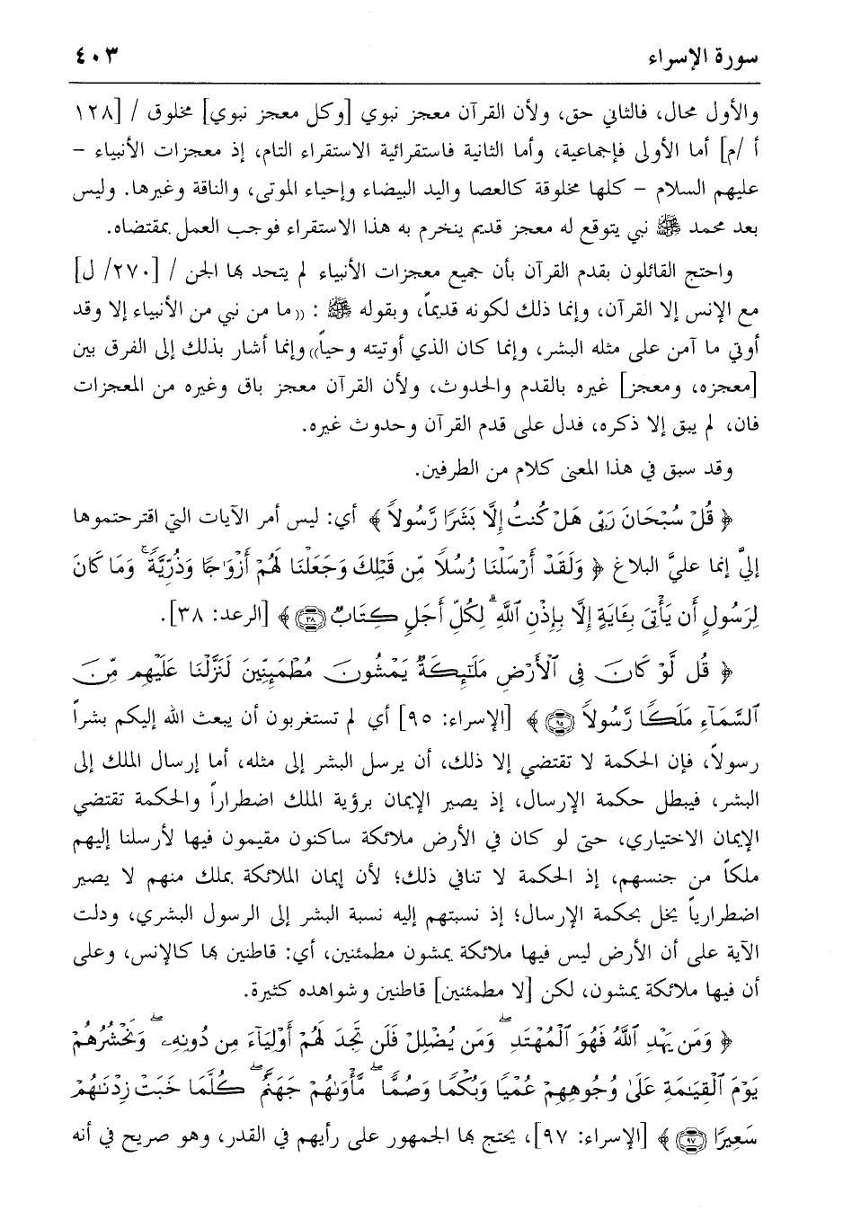 {قُلْ لَوْ كانَ فِي الْأَرْضِ مَلائِكَةٌ يَمْشُونَ مُطْمَئِنِّينَ لَنَزَّلْنا عَلَيْهِمْ مِنَ السَّماءِ مَلَكاً رَسُولاً} (٩٥) [الإسراء: ٩٥] أي لم تستغربون أن يبعث الله إليكم بشرا رسولا، فإن الحكمة لا تقتضي إلا ذلك، أن يرسل البشر إلى مثله، أما إرسال الملك إلى البشر، فيبطل حكمة الإرسال، إذ يصير الإيمان برؤية الملك اضطرارا والحكمة تقتضي الإيمان الاختياري، حتى لو كان في الأرض ملائكة ساكنون مقيمون فيها لأرسلنا إليهم ملكا من جنسهم، إذ الحكمة لا تنافي ذلك؛ لأن إيمان الملائكة بملك منهم لا يصير اضطراريا يخل بحكمة الإرسال؛ إذ نسبتهم إليه نسبة البشر إلى الرسول البشري، ودلت الآية على أن الأرض ليس فيها ملائكة يمشون مطمئنين، أي: قاطنين بها كالإنس، وعلى أن فيها ملائكة يمشون، لكن [لا مطمئنين] قاطنين وشواهده كثيرة.