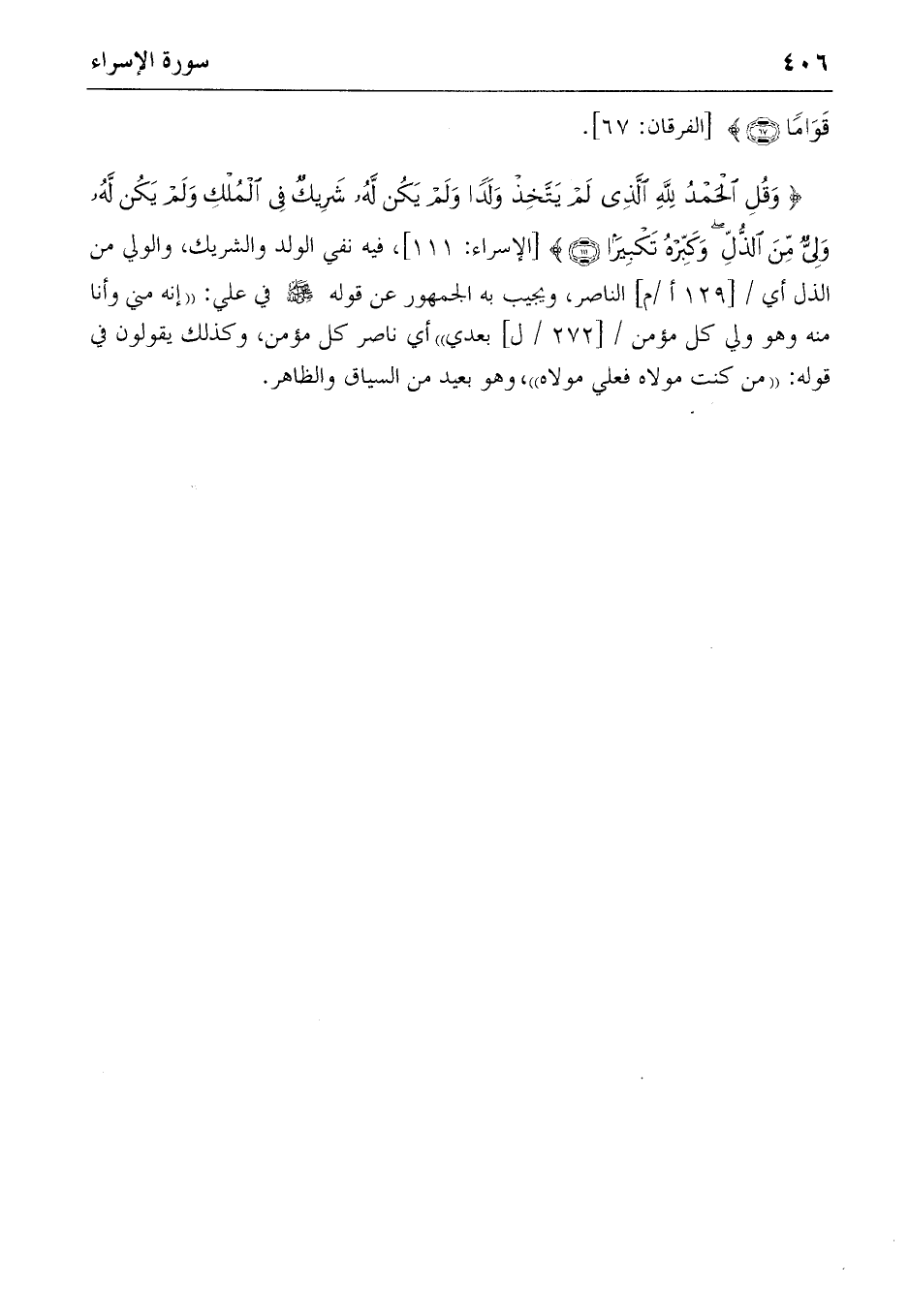 {وَقُلِ الْحَمْدُ لِلّهِ الَّذِي لَمْ يَتَّخِذْ وَلَداً وَلَمْ يَكُنْ لَهُ شَرِيكٌ فِي الْمُلْكِ وَلَمْ يَكُنْ لَهُ وَلِيٌّ مِنَ الذُّلِّ وَكَبِّرْهُ تَكْبِيراً} (١١١) [الإسراء: ١١١]، فيه نفي الولد والشريك، والولي من الذل أي/ [١٢٩ أ/م] الناصر، ويجيب به الجمهور عن قوله صلّى الله عليه وسلّم في علي: «إنه مني وأنا منه وهو ولي كل مؤمن/ [٢٧٢/ل] بعدي» أي ناصر كل مؤمن، وكذلك يقولون في قوله: «من كنت مولاه فعلي مولاه»، وهو بعيد من السياق والظاهر.