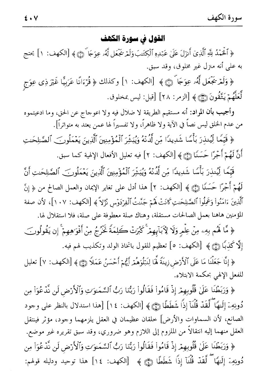 {الْحَمْدُ لِلّهِ الَّذِي أَنْزَلَ عَلى عَبْدِهِ الْكِتابَ وَلَمْ يَجْعَلْ لَهُ عِوَجاً} (١) [الكهف: ١] يحتج به على أنه منزل غير مخلوق، وقد سبق.
