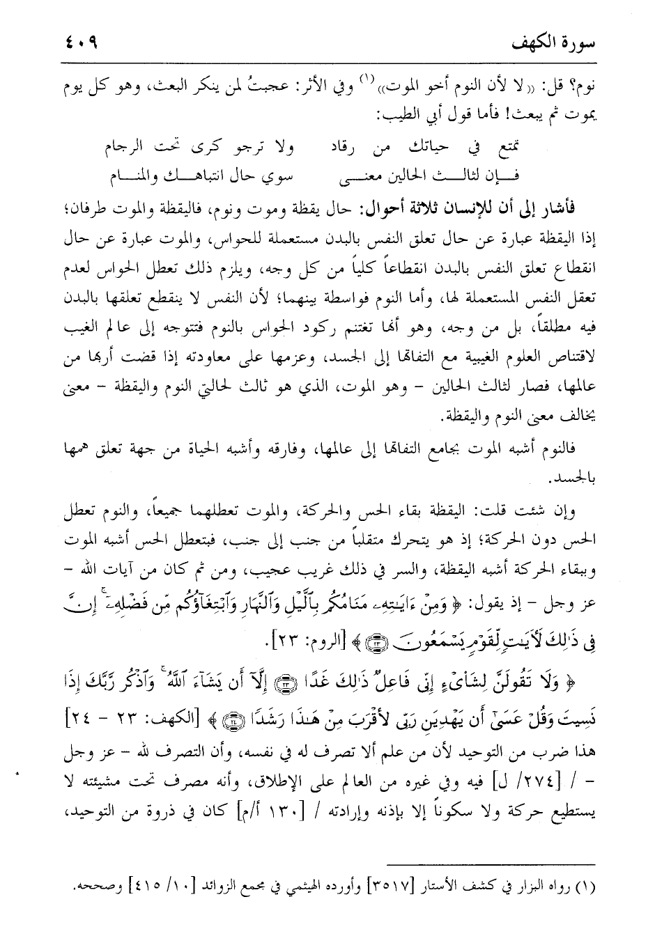 وإن شئت قلت: اليقظة بقاء الحس والحركة، والموت تعطلهما جميعا، والنوم تعطل الحس دون الحركة؛ إذ هو يتحرك متقلبا من جنب إلى جنب، فبتعطل الحس أشبه الموت وببقاء الحركة أشبه اليقظة، والسر في ذلك غريب عجيب، ومن ثم كان من آيات الله- عز وجل-إذ يقول: {وَمِنْ آياتِهِ مَنامُكُمْ بِاللَّيْلِ وَالنَّهارِ وَاِبْتِغاؤُكُمْ مِنْ فَضْلِهِ إِنَّ فِي ذلِكَ لَآياتٍ لِقَوْمٍ يَسْمَعُونَ} (٢٣) [الروم: ٢٣].