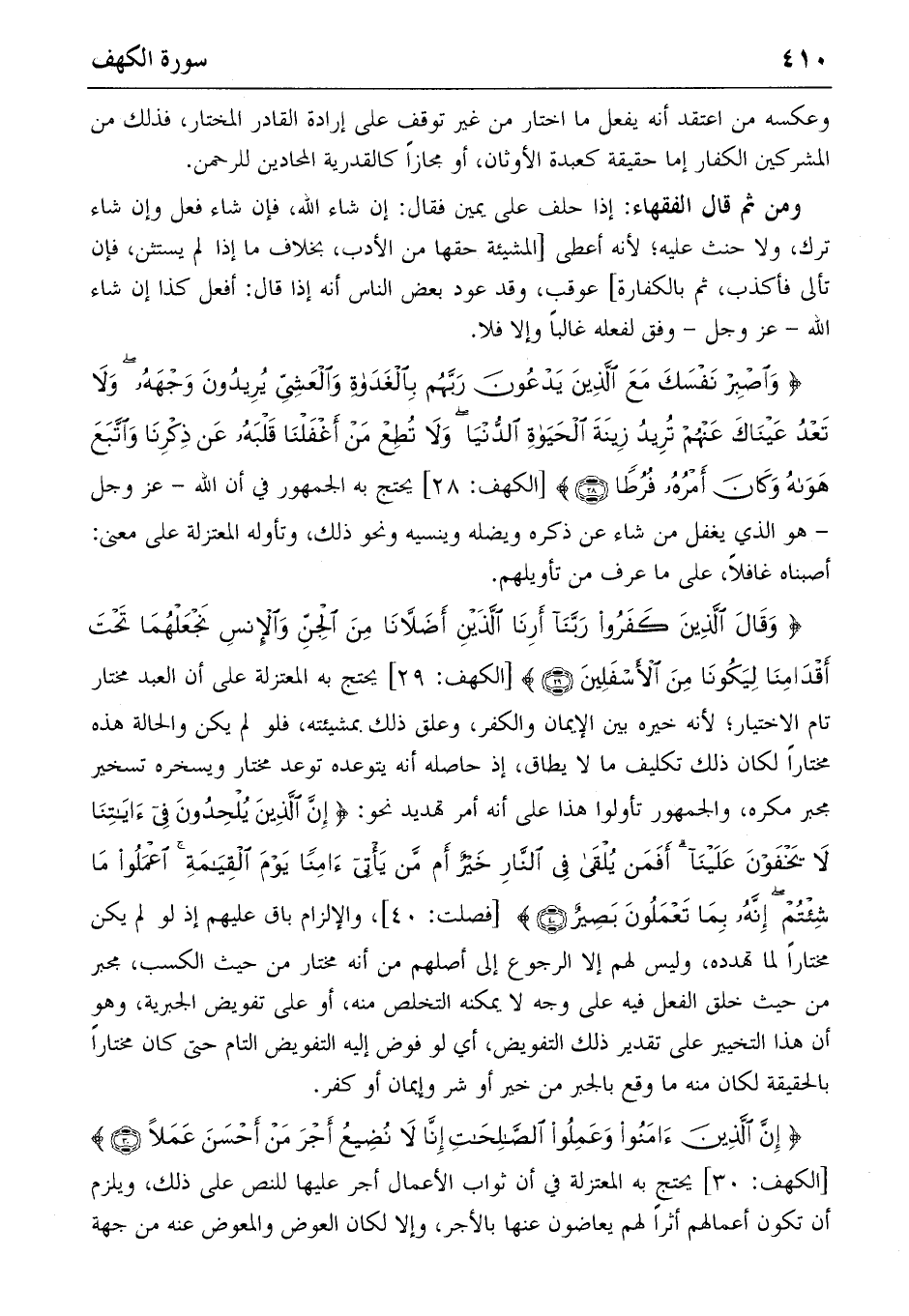 {وَقالَ الَّذِينَ كَفَرُوا رَبَّنا أَرِنَا الَّذَيْنِ أَضَلاّنا مِنَ الْجِنِّ وَالْإِنْسِ نَجْعَلْهُما تَحْتَ أَقْدامِنا لِيَكُونا مِنَ الْأَسْفَلِينَ} (٢٩) [الكهف: ٢٩] يحتج به المعتزلة على أن العبد مختار تام الاختيار؛ لأنه خيره بين الإيمان والكفر، وعلق ذلك بمشيئته، فلو لم يكن والحالة هذه مختارا لكان ذلك تكليف ما لا يطاق، إذ حاصله أنه يتوعده توعد مختار ويسخره تسخير مجبر مكره، والجمهور تأولوا هذا على أنه أمر تهديد نحو: {إِنَّ الَّذِينَ يُلْحِدُونَ فِي آياتِنا لا يَخْفَوْنَ عَلَيْنا أَفَمَنْ يُلْقى فِي النّارِ خَيْرٌ أَمْ مَنْ يَأْتِي آمِناً يَوْمَ الْقِيامَةِ اِعْمَلُوا ما شِئْتُمْ إِنَّهُ بِما تَعْمَلُونَ بَصِيرٌ} (٤٠) [فصلت: ٤٠]، والإلزام باق عليهم إذ لو لم يكن مختارا لما تهدده، وليس لهم إلا الرجوع إلى أصلهم من أنه مختار من حيث الكسب، مجبر من حيث خلق الفعل فيه على وجه لا يمكنه التخلص منه، أو على تفويض الجبرية، وهو أن هذا التخيير على تقدير ذلك التفويض، أي لو فوض إليه التفويض التام حتى كان مختارا بالحقيقة لكان منه ما وقع بالجبر من خير أو شر وإيمان أو كفر.
