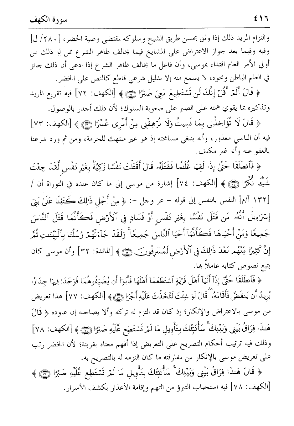 {فَانْطَلَقا حَتّى إِذا لَقِيا غُلاماً فَقَتَلَهُ قالَ أَقَتَلْتَ نَفْساً زَكِيَّةً بِغَيْرِ نَفْسٍ لَقَدْ جِئْتَ شَيْئاً نُكْراً} (٧٤) [الكهف: ٧٤] إشارة من موسى إلى ما كان عنده في التوراة أن/ [١٣٢ أ/م] النفس بالنفس إلى قوله-عز وجل-: {مِنْ أَجْلِ ذلِكَ كَتَبْنا عَلى بَنِي إِسْرائِيلَ أَنَّهُ مَنْ قَتَلَ نَفْساً بِغَيْرِ نَفْسٍ أَوْ فَسادٍ فِي الْأَرْضِ فَكَأَنَّما قَتَلَ النّاسَ جَمِيعاً وَمَنْ أَحْياها فَكَأَنَّما أَحْيَا النّاسَ جَمِيعاً وَلَقَدْ جاءَتْهُمْ رُسُلُنا بِالْبَيِّناتِ ثُمَّ إِنَّ كَثِيراً مِنْهُمْ بَعْدَ ذلِكَ فِي الْأَرْضِ لَمُسْرِفُونَ} (٣٢) [المائدة: ٣٢] وأن موسى كان يتبع نصوص كتابه عاملا بها.