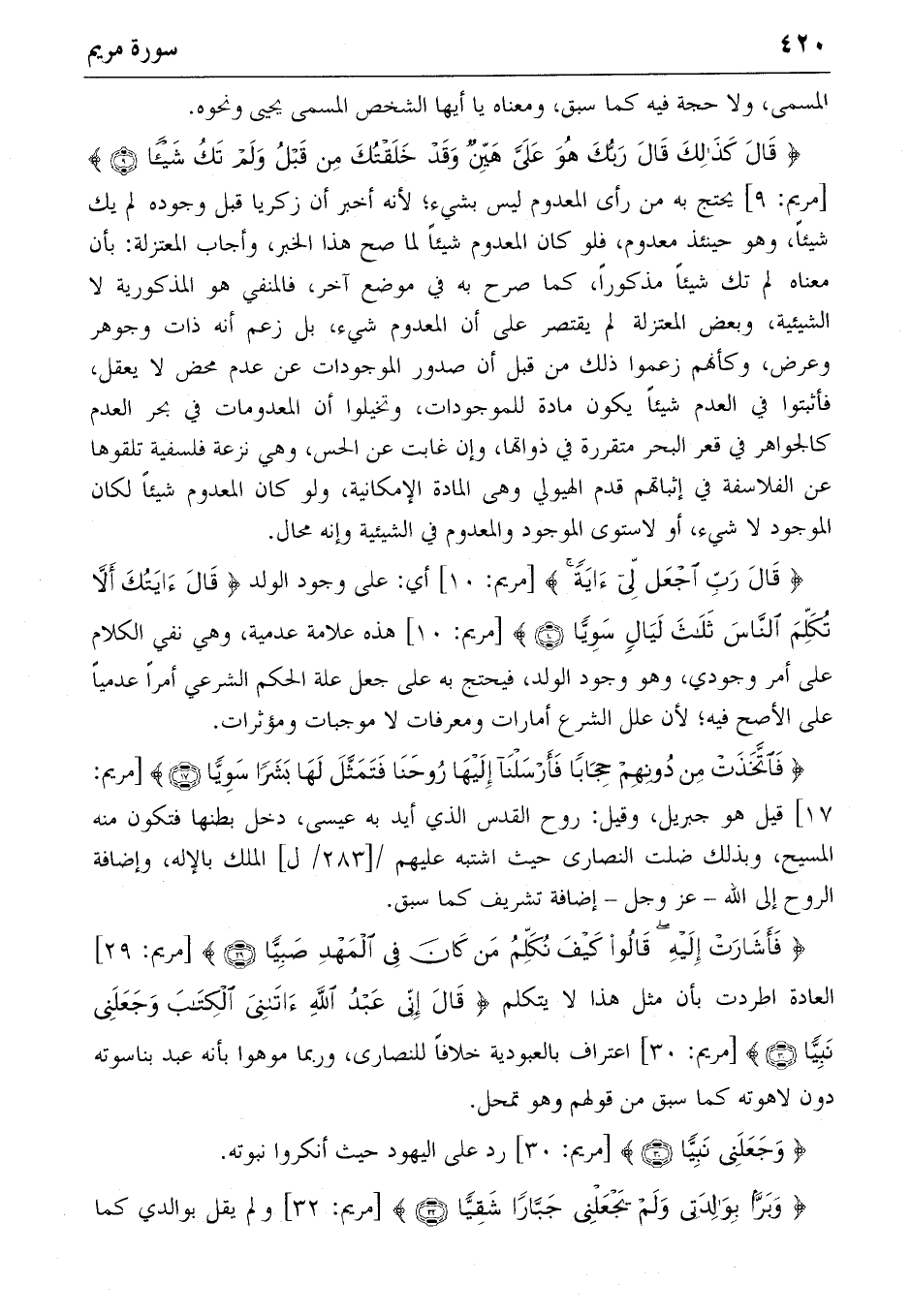 {قالَ كَذلِكَ قالَ رَبُّكَ هُوَ عَلَيَّ هَيِّنٌ وَقَدْ خَلَقْتُكَ مِنْ قَبْلُ وَلَمْ تَكُ شَيْئاً} (٩) [مريم: ٩] يحتج به من رأى المعدوم ليس بشيء؛ لأنه أخبر أن زكريا قبل وجوده لم يك شيئا، وهو حينئذ معدوم، فلو كان المعدوم شيئا لما صح هذا الخبر، وأجاب المعتزلة: بأن معناه لم تك شيئا مذكورا، كما صرح به في موضع آخر، فالمنفي هو المذكورية لا الشيئية، وبعض المعتزلة لم يقتصر على أن المعدوم شيء، بل زعم أنه ذات وجوهر وعرض، وكأنهم زعموا ذلك من قبل أن صدور الموجودات عن عدم محض لا يعقل، فأثبتوا في العدم شيئا يكون مادة للموجودات، وتخيلوا أن المعدومات في بحر العدم كالجواهر في قعر البحر متقررة في ذواتها، وإن غابت عن الحس، وهي نزعة فلسفية تلقوها عن الفلاسفة في إثباتهم قدم الهيولي وهى المادة الإمكانية، ولو كان المعدوم شيئا لكان الموجود لا شيء، أو لاستوى الموجود والمعدوم في الشيئية وإنه محال.