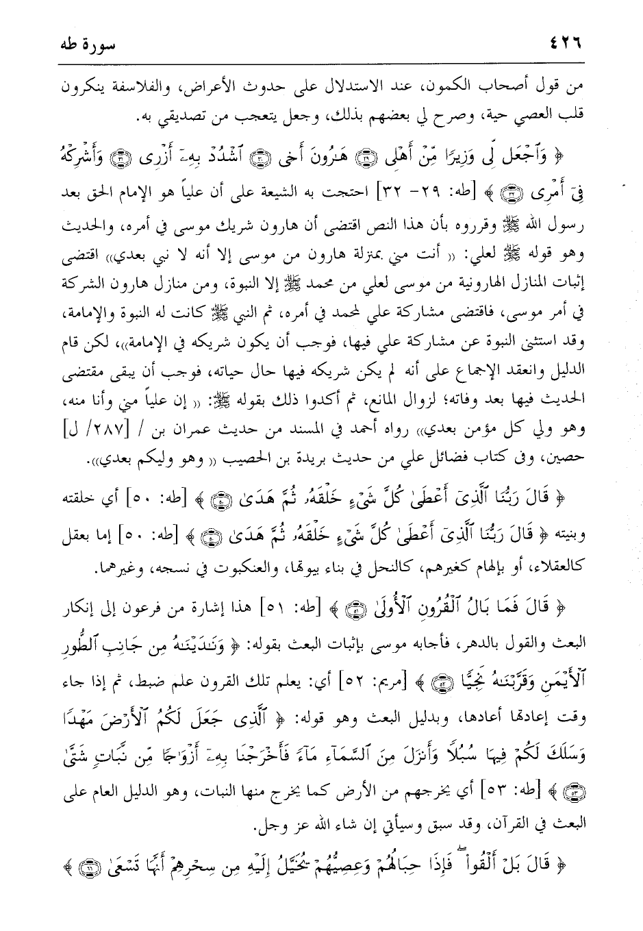 {وَاِجْعَلْ لِي وَزِيراً مِنْ أَهْلِي (٢٩) هارُونَ أَخِي (٣٠) اُشْدُدْ بِهِ أَزْرِي (٣١) وَأَشْرِكْهُ فِي أَمْرِي} (٣٢) [طه: ٢٩ - ٣٢] احتجت به الشيعة على أن عليا هو الإمام الحق بعد رسول الله صلّى الله عليه وسلّم وقرروه بأن هذا النص اقتضى أن هارون شريك موسى في أمره، والحديث وهو قوله صلّى الله عليه وسلّم لعلي: «أنت مني بمنزلة هارون من موسى إلا أنه لا نبي بعدي» اقتضى إثبات المنازل الهارونية من موسى لعلي من محمد صلّى الله عليه وسلّم إلا النبوة، ومن منازل هارون الشركة في أمر موسى، فاقتضى مشاركة علي لمحمد في أمره، ثم النبي صلّى الله عليه وسلّم كانت له النبوة والإمامة، وقد استثنى النبوة عن مشاركة علي فيها، فوجب أن يكون شريكه في الإمامة»، لكن قام الدليل وانعقد الإجماع على أنه لم يكن شريكه فيها حال حياته، فوجب أن يبقى مقتضى الحديث فيها بعد وفاته؛ لزوال المانع، ثم أكدوا ذلك بقوله صلّى الله عليه وسلّم: «إن عليا مني وأنا منه، وهو ولي كل مؤمن بعدي» رواه أحمد في المسند من حديث عمران بن/ [٢٨٧/ل] حصين، وفى كتاب فضائل علي من حديث بريدة بن الحصيب «وهو وليكم بعدي».